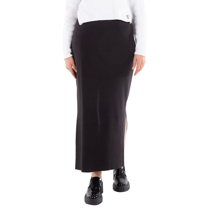 Calvin Klein Ladies Bottoms. Fashion category: Skirts. SKU: J20J223606BEH. Color: Black. Calvin Klein Ribbed Monogram Logo Sweater Maxi Skirt. This skirt is cut in a slim silhouette, featuring a finely ribbed texture that gently hugs your shape. It has a split hem on one side to accentuate the leg line and is detailed with a monogram logo badge at the center waist. 61% lyocell, 34% polyamide, 5% elastane. GENERAL Brand Type: Designer Color: Black INFORMATION Brand: Calvin Klein Gender: Womens Model: J20J223606BEH DETAILS Category: Bottoms Apparel Type: Skirts Material: Lyocell, Elastane, Polyamide ADDITIONAL INFO Jomashop Sku: -J20J223606BEH Department: Clothing
