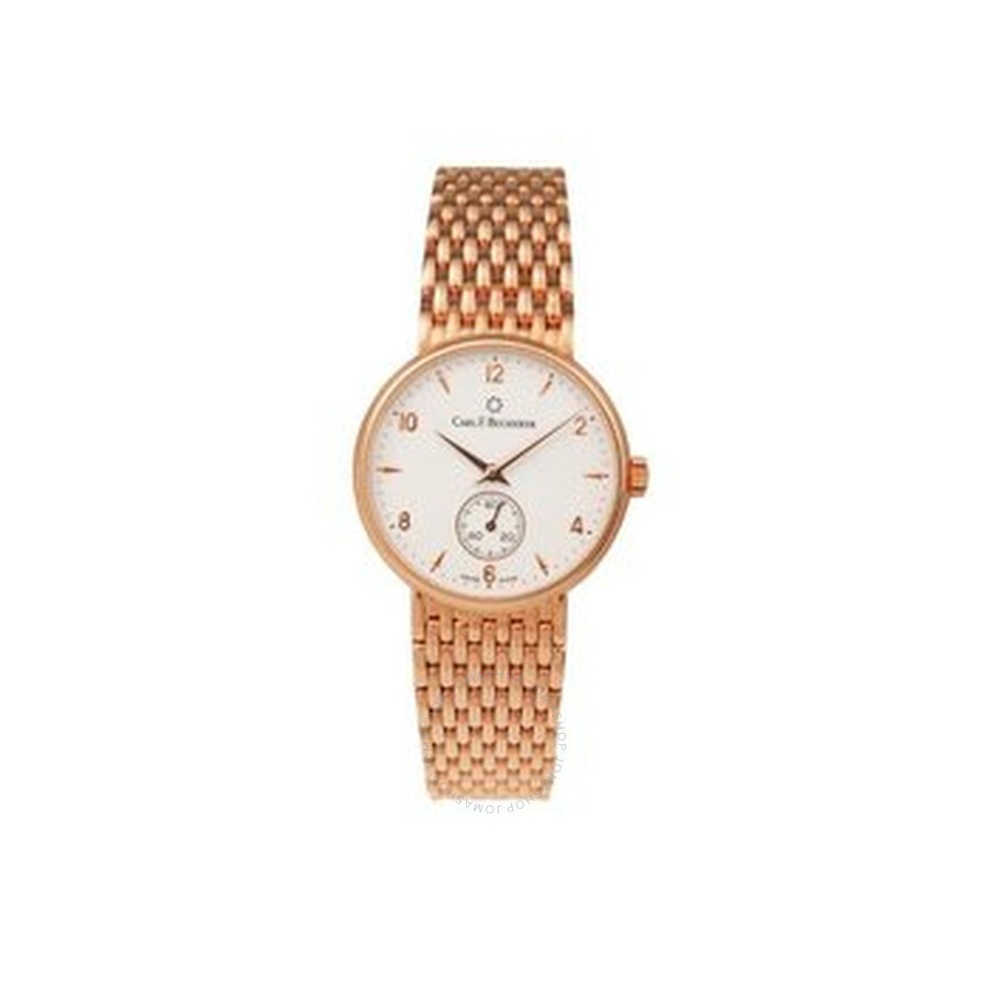 18 carat rose gold case with a 18 carat rose gold bracelet. Fixed bezel. White dial with rose gold-tone hands and index-Arabic numerals hour markers. Dial Type: Analog. One- 60 seconds. Hand wind movement. Scratch resistant sapphire crystal. Pull / push crown. Case size: 27 mm. Round case shape. Water resistant at 30 meters / 100 feet. Functions: hour, minute, second. Luxury watch style. Watch label: Swiss Made. Item Variations: 369.420.8. Carl F. Bucherer Adamavi Ladies Watch 00.10306.03.26.21. INFORMATION Brand: Carl F. Bucherer Series: Adamavi Collection Name: Adamavi Gender: Womens Model: 00.10306.03.26.21 Watch Label: Swiss Made Movement: Hand Wind Engine: Carl F. Bucherer Calibre CFB 1968 Power Reserve: 42 hours CASE Case Size: 27 mm Case Material: 18kt Rose Gold Case Shape: Round BAND Band Material: 18kt Rose Gold Band Type: Bracelet Band Color: Rose Gold-tone DIAL Dial Color: White Type: Analog Crystal: Scratch Resistant Sapphire Hands: Rose Gold-tone Dial Markers: Index-Arabic Numerals Sub Dials: One - Small Second Bezel: Fixed Bezel Material: 18kt Rose Gold Crown: Pull / Push FEATURES Water Resistance: 30 meters / 100 feet Functions: Hour, Minute, Second Watch Features: Gold, Analog ADDITIONAL INFO Watch Style: Luxury Warranty: 2 Year Jomashop Warranty Jomashop Sku: CFB0010306032621 Item Variation: 369.420.8 Department: Watches Category: Watches