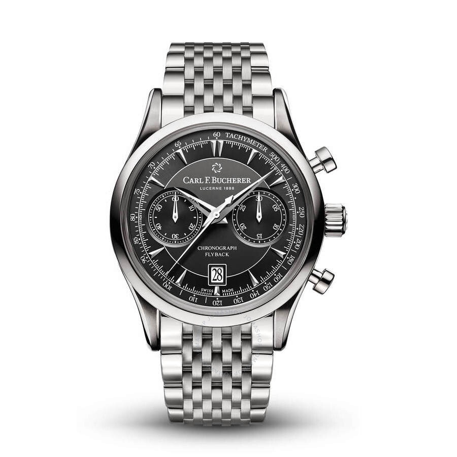 Stainless steel case with a stainless steel bracelet. Fixed stainless steel bezel. Black dial with silver-tone skeleton hands and index hour markers. Minute markers. Tachymeter markings around the outer rim. Dial Type: Analog. Date display at the 6 o'clock position. Chronograph - two sub-dials displaying: 60 second and 30 minute. Carl F. Bucherer calibre CFB 1970 automatic movement, based upon ETA 7750, containing 25 Jewels, bitting at 28800 vph, and has a power reserve of approximately 42 hours. Scratch resistant sapphire crystal. Screw down crown. Transparent case back. Round case shape. Case size: 43 mm. Case thickness: 14.45 mm. Band width: 22 mm. Fold over clasp. Water resistant at 30 meters / 100 feet. Functions: chronograph, tachymeter, hour, minute, second. Manero Flyback Series. Sport watch style. Watch label: Swiss Made. Carl F. Bucherer Manero Flyback Chronograph Automatic Black Dial Men's Watch 00.10919.08.33.21. INFORMATION Brand: Carl F. Bucherer Series: Manero Flyback Collection Name: Manero Flyback Gender: Mens Model: 00.10919.08.33.21 Watch Label: Swiss Made Movement: Automatic Engine: Carl F. Bucherer Calibre CFB 1970 Power Reserve: 42 hours CASE Case Size: 43 mm Case Thickness: 14.45 mm Case Material: Stainless Steel Case Shape: Round Case Back: Transparent BAND Band Material: Stainless Steel Band Type: Bracelet Band Color: Silver-tone Band Width: 22 mm Clasp: Fold Over DIAL Dial Color: Black Type: Analog Crystal: Scratch Resistant Sapphire Hands: Silver-tone Skeleton Dial Markers: Index Second Markers: Minute Markers. Tachymeter Markings around the outer rim Sub Dials: Two - 60 Second and 30 Minute Bezel: Fixed Bezel Color: Silver-tone Bezel Material: Stainless Steel Crown: Screw Down FEATURES Water Resistance: 30 meters / 100 feet Calendar: Date display at the 6 o'clock position Functions: Chronograph, Tachymeter, Hour, Minute, Second Watch Features: Chronograph, Stainless Steel, Flyback, Analog ADDITIONAL INFO Watch Style: Sport Warranty: 2 Year Jomashop Warranty Jomashop Sku: CFB0010919083321 Department: Watches Category: Watches