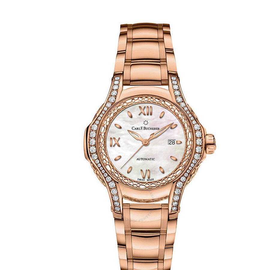 18 carat rose gold case with a 18 carat rose gold bracelet. Fixed bezel. Mother of pearl dial with rose gold-tone hands and index-Roman numerals hour markers. Dial Type: Analog. Date display at the 3 o'clock position. Automatic movement with about 38 hours of power reserve. Scratch resistant sapphire crystal. Pull / push crown. Case size: 34 mm. Case thickness: 9.65 mm. Round case shape. Water resistant at 30 meters / 100 feet. Functions: date, hour, minute, second. Luxury watch style. Watch label: Swiss Made. Item Variations: 369.429.7. Carl F. Bucherer Pathos Diva Automatic Ladies Watch 00.10580.03.75.21.01. INFORMATION Brand: Carl F. Bucherer Series: Pathos Diva Collection Name: Pathos Diva Gender: Womens Model: 00.10580.03.75.21.01 Watch Label: Swiss Made Movement: Automatic Engine: Carl F. Bucherer Calibre CFB 1963 Power Reserve: 38 hours CASE Case Size: 34 mm Case Thickness: 9.65 mm Case Material: 18kt Rose Gold Case Shape: Round BAND Band Material: 18kt Rose Gold Band Type: Bracelet Band Color: Rose Gold-tone DIAL Dial Color: Mother Of Pearl Type: Analog Crystal: Scratch Resistant Sapphire Hands: Rose Gold-tone Dial Markers: Index-Roman Numerals Bezel: Fixed Bezel Color: 18kt Rose Gold Bezel Material: Diamond Set Crown: Pull / Push FEATURES Water Resistance: 30 meters / 100 feet Calendar: Date display at the 3 o'clock position Functions: Date, Hour, Minute, Second Watch Features: Gold, Analog ADDITIONAL INFO Watch Style: Luxury Warranty: 2 Year Jomashop Warranty Jomashop Sku: CFB001058003752101 Item Variation: 369.429.7 Department: Watches Category: Watches