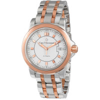 18kt rose gold and stainless steel case with a two-tone (silver-tone and rose gold-tone) 18kt rose gold and stainless steel bracelet. Fixed bezel. Silver dial with rose gold-tone hands and index hour markers. Minute markers around the outer rim. Dial Type: Analog. Luminescent hands and markers. Date display at the 3 o'clock position. Carl F. Bucherer Calibre CFB 1950 Automatic movement, containing 26 Jewels, bitting at 28800 vph, and has a power reserve of approximately 38 hours. Scratch resistant sapphire crystal. Screw down crown. Skeleton transparent exhibition see through case back. Round case shape, case size: 38 mm. Water resistant at 50 meters / 165 feet. Functions: date, hour, minute, second. Patravi Series. Luxury watch style. Watch label: Swiss Made. Item Variations: 166.400.6. Carl F. Bucherer Patravi Automatic Men's Watch 00.10617.07.23.21. INFORMATION Brand: Carl F. Bucherer Series: Patravi Collection Name: Patravi Gender: Mens Model: 00.10617.07.23.21 Watch Label: Swiss Made Movement: Automatic Engine: Carl F. Bucherer Calibre CFB 1950 Power Reserve: 38 hours CASE Case Size: 38 mm Case Material: 18kt Rose Gold and Stainless Steel Case Shape: Round Case Back: Skeleton Transparent Exhibition See Through BAND Band Material: 18kt Rose Gold and Stainless Steel Band Type: Bracelet Band Color: Two-tone (Silver-tone and Rose Gold-tone) DIAL Dial Color: Silver Type: Analog Crystal: Scratch Resistant Sapphire Hands: Rose Gold-tone Dial Markers: Index Second Markers: Minute Markers around the outer rim Luminiscence: Hands and Markers Bezel: Fixed Crown: Screw Down FEATURES Water Resistance: 50 meters / 165 feet Calendar: Date display at the 3 o'clock position Functions: Date, Hour, Minute, Second Watch Features: Stainless Steel, Gold, Analog ADDITIONAL INFO Watch Style: Luxury Warranty: 2 Year Jomashop Warranty Jomashop Sku: CFB0010617072321 Item Variation: 166.400.6 Department: Watches Category: Watches