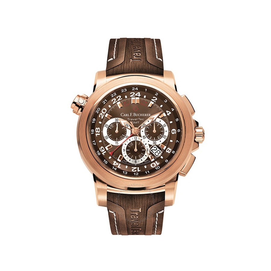 18k rose gold case with a brown rubber strap. Fixed 18k rose gold bezel. Brown dial with silver-tone hands and index hour markers. 24 hour markers around the inner rim. Dial Type: Analog. Luminescent hands and markers. Date display between 4 and 5 o'clock position. Chronograph - sub-dials displaying: 12 hours, 30 minutes, 60 seconds. Carl F. Bucherer Calibre 1901.1 automatic movement with a 42-hour power reserve. Scratch resistant sapphire crystal. Screw down crown. Round case shape, case size: 46.6 mm. Folding clasp. Water resistant at 50 meters / 165 feet. Functions: GMT, second time zone, hour, minute, second, date, chronograph. Patravi Traveltec Series. Luxury watch style. Watch label: Swiss Made. Carl F. Bucherer Patravi TravelTec Chronograph Automatic Brown Dial Men's Watch 00.10620.03.93.02. INFORMATION Brand: Carl F. Bucherer Series: Patravi Traveltec Collection Name: Patravi TravelTec Gender: Mens Model: 00.10620.03.93.02 Watch Label: Swiss Made Movement: Automatic Engine: Carl F. Bucherer Calibre 1901.1 Power Reserve: 42 hours CASE Case Size: 46.6 mm Case Material: 18k Rose Gold Case Shape: Round BAND Band Material: Rubber Band Type: Strap Band Color: Brown Clasp: Folding DIAL Dial Color: Brown Type: Analog Crystal: Scratch Resistant Sapphire Hands: Silver-tone Dial Markers: Index Second Markers: 24 Hour Markers around the inner rim Sub Dials: 12 Hours, 30 Minutes, 60 Seconds Luminiscence: Hands and Markers Bezel: Fixed Bezel Material: 18k Rose Gold Crown: Screw Down FEATURES Water Resistance: 50 meters / 165 feet Calendar: Date display between 4 and 5 o'clock position Functions: GMT, Second Time Zone, Hour, Minute, Second, Date, Chronograph Watch Features: Analog, GMT, Gold, Rubber, Chronograph, Time Zone ADDITIONAL INFO Watch Style: Luxury Warranty: 2 Year Jomashop Warranty Jomashop Sku: CFB0010620039302 Department: Watches Category: Watches