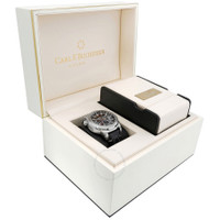 Silver-tone stainless steel case with a black leather strap. Fixed silver-tone stainless steel bezel. Black dial with silver-tone hands and index hour markers. Gmt markers around the outer rim. Dial Type: Analog. Luminescent hands and markers. Date display between 4 and 5 o'clock position. Chronograph - three sub-dials displaying: 60 seconds, 30 minutes, 12 hours. Carl F. Bucherer Calibre CFB 1901.1 Automatic movement, based upon ETA 2894, containing 39 Jewels, bitting at 28800 vph, and has a power reserve of approximately 42 hours. Scratch resistant sapphire crystal. Screw down crown. Skeleton transparent exhibition see through case back. Round case shape, case size: 46.6 mm, case thickness: 15 mm. Water resistant at 50 meters / 165 feet. Functions: chronograph, date, GMT, second time zone, hour, minute, small second, chronometer. Patravi Traveltec Series. Luxury watch style. Watch label: Swiss Made. Item Variations: 166.200.0. Carl F. Bucherer Patravi Traveltec Chronograph Automatic Men's Watch 00.10620.08.33.01. INFORMATION Brand: Carl F. Bucherer Series: Patravi Traveltec Collection Name: Patravi Traveltec Gender: Mens Model: 00.10620.08.33.01 Watch Label: Swiss Made Movement: Automatic Engine: Carl F. Bucherer Calibre CFB 1901.1 Power Reserve: 42 hours CASE Case Size: 46.6 mm Case Thickness: 15 mm Case Material: Stainless Steel Case Shape: Round Case Back: Skeleton Transparent Exhibition See Through BAND Band Material: Leather Band Type: Strap Band Color: Black DIAL Dial Color: Black Type: Analog Crystal: Scratch Resistant Sapphire Hands: Silver-tone Dial Markers: Index Second Markers: GMT Markers around the outer rim Sub Dials: Three - 60 Second, 30 Minute and 12 Hour Luminiscence: Hands and Markers Bezel: Fixed Bezel Color: Silver-tone Bezel Material: Stainless Steel Crown: Screw Down FEATURES Water Resistance: 50 meters / 165 feet Calendar: Date display between 4 and 5 o'clock position Functions: Chronograph, Date, GMT, Second Time Zone, Hour, Minute, Small Second, Chronometer Watch Features: Analog, GMT, Chronometer, Leather, Stainless Steel, Chronograph, Time Zone ADDITIONAL INFO Watch Style: Luxury Warranty: 2 Year Jomashop Warranty Jomashop Sku: CFB0010620083301 Item Variation: 166.200.0 Department: Watches Category: Watches