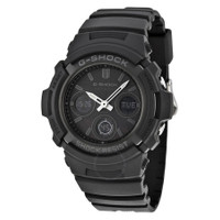 Black resin case with a black resin strap. Fixed black resin bezel. Black dial with silver-tone hands and index hour markers. Minute markers around the outer rim. Dial Type: Analog-digital. Luminescent hands and markers. Three digital sub-dials displaying: date, day of week and seconds. Quartz movement. Scratch resistant mineral crystal. Solid case back. Case diameter: 46.4 mm. Case thickness: 14.9 mm. Round case shape. Band width: 16 mm. Tang clasp. Water resistant at 200 meters / 660 feet. Additional Info: World time 31 times zones (48 cities + UTC) city code display daylight saving on/off 5 daily alarms hourly time signal 1/100 second stopwatch measurin. Sport watch style. Casio G-Shock Tough Solar Power Atomic Men's Watch AWGM100B-1A. GENERAL Color: Black INFORMATION Brand: Casio Series: G-Shock Collection Name: G-Shock Gender: Mens Model: AWGM100B-1A Watch Label: Japan Movt Movement: Quartz Engine: Casio Calibre 5230 CASE Case Size: 46.4 mm Case Thickness: 14.9 mm Case Color: Black Case Material: Resin Case Shape: Round Case Back: Solid BAND Band Material: Resin Band Type: Strap Band Color: Black Band Width: 16 mm Clasp: Tang DIAL Dial Color: Black Type: Analog-Digital Crystal: Scratch Resistant Mineral Hands: Silver-tone Dial Markers: Index Second Markers: Minute Markers around the outer rim Sub Dials: Three - Date, Day of Week and Second Luminiscence: Hands and Markers Bezel: Fixed Bezel Color: Black Bezel Material: Resin Crown: Screw Down FEATURES Water Resistance: 200 meters / 660 feet Calendar: Perpetual Calendar Functions: Chronograph, World time , Date, Hour, Minute, Second Watch Features: Digital, Analog, World Time, Solar, Perpetual, Chronograph, Atomic Timekeeping, Alarm ADDITIONAL INFO Watch Style: Sport Warranty: 1 Year Jomashop Warranty UPC Code: 079767954352 Additional Info: World Time 31 times zones (48 cities + UTC) city code display daylight saving on/off 5 Daily Alarms Hourly Time Signal 1/100 second stopwatch Measurin Jomashop Sku: CSAWGM100B-1A Item Variation: AWGM100B 1A, AWGM100B.1A, AWGM100B1A Department: Watches Category: Watches