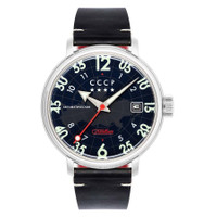Silver-tone stainless steel case with a black leather strap. Fixed silver-tone stainless steel bezel. Blue dial with silver-tone hands and Arabic & index hour markers. Dial Type: Analog. Luminescent hands and markers. Date display at the 3 o'clock position. Automatic movement. Pull / push crown. Round case shape, case size: 43 mm, case thickness: 13.5 mm. Band width: 20 mm. Functions: date, hour, minute, second. Hereos Comrade Series. Dress watch style. CCCP Hereos Comrade Automatic Blue Dial Men's Watch CP-7097-01. GENERAL Box Type: Original Box CASE Case Diameter: 43 mm Case Thickness: 13.5 mm Case Material: Stainless Steel Case Shape: Round BAND Band Material: Leather Band Type: Strap Band Color: Black Band Width: 20 mm DIAL Dial Color: Blue Type: Analog Hands: Silver-tone Dial Markers: Arabic & Index Luminiscence: Hands and Markers Bezel: Fixed Bezel Color: Silver-tone Bezel Material: Stainless Steel Crown: Pull / Push INFORMATION Brand: Cccp Series: Hereos Comrade Collection Name: Hereos Comrade Gender: Mens Model: CP-7097-01 Movement: Automatic FEATURES Calendar: Date display at the 3 o'clock position Functions: Date, Hour, Minute, Second Watch Features: Analog, Leather, Stainless Steel ADDITIONAL INFO Watch Style: Dress Jomashop Sku: Y-A4D99 Department: Watches Category: Watches