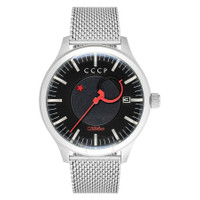 Silver-tone stainless steel case and bracelet. Fixed silver-tone stainless steel bezel. Black dial with red hands and Arabic & index hour markers. Minute markers around the outer rim. Dial Type: Analog. Date display at the 3 o'clock position. Automatic movement. Pull / push crown. Round case shape, case size: 43 mm, case thickness: 13 mm. Band width: 20 mm. Fold over clasp with a safety release. Functions: date, hour, minute, second. Heroes Kamzolkin Series. Dress watch style. CCCP Heroes Kamzolkin Automatic Black Dial Men's Watch CP-7077-44. CASE Case Diameter: 43 Case Thickness: 13 mm Case Material: Stainless Steel Case Shape: Round BAND Band Material: Stainless Steel Band Type: Bracelet Band Color: Silver-tone Band Width: 20 mm Clasp: Fold Over with Safety Release DIAL Dial Color: Black Type: Analog Hands: Red Dial Markers: Arabic & Index Second Markers: Minute Markers around the outer rim Bezel: Fixed Bezel Color: Silver-tone Bezel Material: Stainless Steel Crown: Pull / Push INFORMATION Brand: Cccp Series: Heroes Kamzolkin Collection Name: Heroes Kamzolkin Gender: Mens Model: CP-7077-44 Movement: Automatic FEATURES Calendar: Date display at the 3 o'clock position Functions: Date, Hour, Minute, Second Watch Features: Stainless Steel, Analog ADDITIONAL INFO Watch Style: Dress Jomashop Sku: Y-A4D9Q Department: Watches Category: Watches