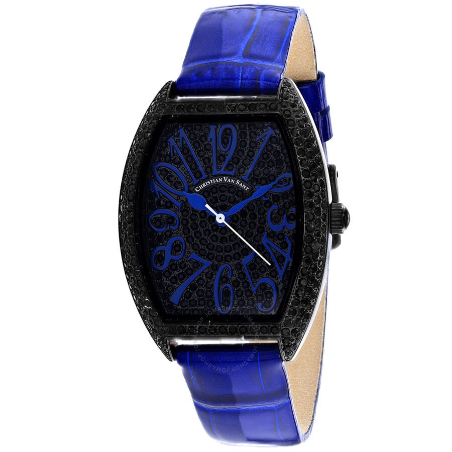 Black brass case with a blue stainless steel bracelet. Fixed blue stainless steel bezel. Black dial with blue hands and index hour markers. Dial Type: Analog. Quartz movement. Scratch resistant mineral crystal. Tonneau case shape, case size: 41 mm. Band width: 16 mm. Buckle clasp. Water resistant at 30 meters / 100 feet. Functions: hour, minute, second. Elegant Series. Fashion watch style. Christian Van Sant Elegant Quartz Black Dial Ladies Watch CV4824. INFORMATION Brand: Christian Van Sant Series: Elegant Collection Name: Elegant Gender: Womens Model: CV4824 Movement: Quartz CASE Case Size: 41 mm Case Material: Brass Case Shape: Tonneau BAND Band Material: Stainless Steel Band Type: Bracelet Band Color: Blue Band Width: 16 mm Clasp: Buckle DIAL Dial Color: Black Type: Analog Crystal: Scratch Resistant Mineral Hands: Blue Dial Markers: Index Bezel: Fixed Bezel Color: Blue Bezel Material: Stainless Steel FEATURES Water Resistance: 30 meters / 100 feet Functions: Hour, Minute, Second Watch Features: Stainless Steel, Analog ADDITIONAL INFO Watch Style: Fashion UPC Code: 671875971193 Jomashop Sku: CV-CV4824 Department: Watches Category: Watches