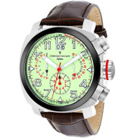 Silver-tone stainless steel case with a brown leather strap. Fixed black stainless steel bezel. Green dial with silver-tone hands and index hour markers. Minute markers around the outer rim. Dial Type: Analog. Luminescent hands and markers. Date display at the 12 o'clock position. Quartz movement. Scratch resistant mineral crystal. Round case shape, case size: 48 mm. Band width: 21 mm. Deployment with push button release clasp. Water resistant at 100 meters / 330 feet. Functions: chronograph, date, hour, minute, second. Grand Python Series. Fashion watch style. Christian Van Sant Grand Python Green Dial Men's Watch CV3AU6. INFORMATION Brand: Christian Van Sant Series: Grand Python Collection Name: Grand Python Gender: Mens Model: CV3AU6 Movement: Quartz CASE Case Size: 48 mm Case Material: Stainless Steel Case Shape: Round BAND Band Material: Leather Band Type: Strap Band Color: Brown Band Width: 21 mm Clasp: Deployment with Push Button Release DIAL Dial Color: Green Type: Analog Crystal: Scratch Resistant Mineral Hands: Silver-tone Dial Markers: Index Second Markers: Minute Markers around the outer rim Luminiscence: Hands and Markers Bezel: Fixed Bezel Color: Black Bezel Material: Stainless Steel FEATURES Water Resistance: 100 meters / 330 feet Calendar: Date display at the 12 o'clock position Functions: Chronograph, Date, Hour, Minute, Second Watch Features: Chronograph, Stainless Steel, Leather, Analog ADDITIONAL INFO Watch Style: Fashion UPC Code: 671875971124 Jomashop Sku: CV-CV3AU6 Department: Watches Category: Watches