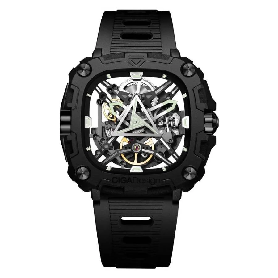 Black ceramic case with a black silicone strap. Fixed black ceramic bezel. Transparent dial with silver-tone hands. Dial Type: Analog. Luminescent hands and markers. The CIGA Design Series X watches are powered by the brand’s in-house calibre CD-01, which is designed meticulously to complement the skeleton dial of the collection. The self-winding CD-01 showcases a minimalist web of skeleton bridges that reveal the intricacies of the fully visible gear train, along with the cutaway mainspring barrel positioned at 12 o’clock and the balance wheel at six. The movement contributes immensely to th watch's visual appeal, particularly the constant motion of the balance wheel. Interestingly, the mainspring barrel doubles as a practical power reserve indicator. The finishing on the CD-01 is deliberately understated, featuring matte blasting across the bridges and a DLC-coated skeleton rotor, with its central segment in perlage. In terms of performance, the CD-01 offers a 40-hour power reserve at a 28,000 bph frequency. Scratch resistant mineral crystal. Pull / push crown. Transparent see through case back. Cushion case shape, case size: 47.30 mm, case thickness: 12.10 mm. Buckle clasp. Water resistant at 30 meters / 100 feet. Functions: hour, minute, second. X Series Eye Of Horus Series. Sport watch style. Ciga Design X Series Eye Of Horus Automatic Men's Watch X051-BB01-W5B. GENERAL Box Type: Original Box CASE Case Diameter: 47.30 mm Case Thickness: 12.10 mm Case Material: Ceramic Case Shape: Cushion Case Back: Transparent See Through BAND Band Material: Silicone Band Type: Strap Band Color: Black Clasp: Buckle DIAL Dial Color: Transparent Type: Analog Crystal: Scratch Resistant Mineral Hands: Silver-tone Luminiscence: Hands and Markers Bezel: Fixed Bezel Color: Black Bezel Material: Ceramic Crown: Pull / Push INFORMATION Brand: Ciga Design Series: Eye Of Horus Collection Name: Eye Of Horus Gender: Mens Model: X051-BB01-W5B Movement: Automatic Engine: Ciga Design Calibre CD-01 Power Reserve: 40 hours FEATURES Water Resistance: 30 meters / 100 feet Functions: Hour, Minute, Second Watch Features: Ceramic, Power Reserve Indicator, Analog ADDITIONAL INFO Watch Style: Sport UPC Code: 6971311244480 Jomashop Sku: Z-VS3KR Department: Watches