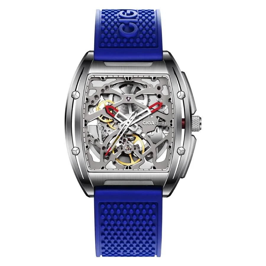 Silver-tone 316L stainless steel case with a blue silicone strap. Fixed silver-tone 316L stainless steel bezel. Skeleton dial with silver-tone, red hands. Dial Type: Analog. Luminescent hands and markers. CIGA Design often uses exclusive, customised movements developed in collaboration with the Tianjin-based watchmaker SEAGULL. This is one such self-winding mechanical movement that powers many of their timepieces, operating at a frequency of 21,600 vibrations per hour. It is equipped with 25 jewels and provides a power reserve of approximately 40 hours. In keeping with CIGA Design’s tradition of skeletonised dials, SEAGULL movements are distinguished by their striking architecture and refined finishing. Each movement also undergoes four rigorous tests to ensure exceptional accuracy. Scratch resistant sapphire crystal. Pull / push crown. Transparent see through case back. Tonneau case shape, case size: 40.8 mm, case thickness: 12.3 mm. Band width: 22 mm. Buckle clasp. Water resistant at 30 meters / 100 feet. Functions: hour, minute, second. Edge Series. Sport watch style. Ciga Design Z Series Edge Automatic Men's Watch Z031-SS01-W5BU. GENERAL Box Type: Original Box CASE Case Diameter: 40.8 mm Case Thickness: 12.3 mm Case Material: 316L Stainless Steel Case Shape: Tonneau Case Back: Transparent See Through BAND Band Material: Silicone Band Type: Strap Band Color: Blue Band Width: 22 mm Clasp: Buckle DIAL Dial Color: Skeleton Type: Analog Crystal: Scratch Resistant Sapphire Hands: Silver-tone, Red Luminiscence: Hands and Markers Bezel: Fixed Bezel Color: Silver-tone Bezel Material: 316L Stainless Steel Crown: Pull / Push INFORMATION Brand: Ciga Design Series: Edge Collection Name: Edge Gender: Mens Model: Z031-SS01-W5BU Movement: Automatic Power Reserve: 40 hours FEATURES Water Resistance: 30 meters / 100 feet Functions: Hour, Minute, Second Watch Features: Stainless Steel, Analog ADDITIONAL INFO Watch Style: Sport UPC Code: 6971311245708 Jomashop Sku: Z-Y5RP9 Department: Watches
