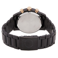 Black stainless steel case and bracelet. Fixed black stainless steel bezel. Black dial with rose gold-tone hands and index hour markers. Minute markers around the outer rim. Dial Type: Analog. Date display at the 3 o'clock position. Chronograph - three sub-dials displaying: 60 second, 60 minute and 24 hour. Citizen Caliber Eco-Drive B612 eco-drive movement. Scratch resistant mineral crystal. Solid case back. Round case shape, case size: 43 mm, case thickness: 11.4 mm. Deployment with push button release clasp. Water resistant at 100 meters / 330 feet. Functions: chronograph, date, hour, minute, second, solar-powered. Sport watch style. Watch label: Japan Movt. Citizen Chronograph Eco-Drive Black Dial Men's Watch CA0746-85E. CASE Case Size: 43 Case Thickness: 11.4 mm Case Material: Stainless Steel Case Shape: Round Case Back: Solid BAND Band Material: Stainless Steel Band Type: Bracelet Band Color: Black Clasp: Deployment with Push Button Release DIAL Dial Color: Black Type: Analog Crystal: Mineral Hands: Rose Gold-tone Dial Markers: Index Second Markers: Minute Markers around the outer rim Sub Dials: Three - 60 Second, 60 Minute and 24 Hour Bezel: Fixed Bezel Color: Black Bezel Material: Stainless Steel INFORMATION Brand: Citizen Gender: Mens Model: CA0746-85E Watch Label: Japan Movt Movement: Eco-Drive Engine: Citizen Caliber Eco-Drive B612 FEATURES Water Resistance: 100 meters / 330 feet Calendar: Date display at the 3 o'clock position Functions: Chronograph, Date, Hour, Minute, Second, Solar-powered Watch Features: Analog, Solar, Gold, Stainless Steel, Chronograph ADDITIONAL INFO Watch Style: Sport Warranty: 5 Year Jomashop Warranty Jomashop Sku: CZCA0746-85E Department: Watches
