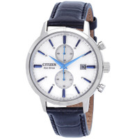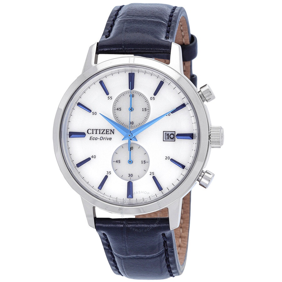 Silver-tone stainless steel case with a blue leather strap. Fixed silver-tone stainless steel bezel. White dial with blue hands and index hour markers. Minute markers around the outer rim. Dial Type: Analog. Date display at the 3 o'clock position. Chronograph - two sub-dials displaying: 60 second and 60 minute. Citizen Caliber B642 quartz movement. Scratch resistant mineral crystal. Pull / push crown. Solid case back. Round case shape, case size: 42 mm, case thickness: 12 mm. Band width: 20 mm. Buckle clasp. Water resistant at 50 meters / 165 feet. Functions: chronograph, date, hour, minute, second. Core Collection Series. Sport watch style. Watch label: Japan Made. Citizen Core Collection Chronograph Quartz White Dial Men's Watch CA7069-16A. INFORMATION Brand: Citizen Series: Core Collection Collection Name: Core Collection Gender: Mens Model: CA7069-16A Watch Label: Japan Made Movement: Quartz Engine: Citizen Caliber B642 CASE Case Size: 42 mm Case Thickness: 12 mm Case Material: Stainless Steel Case Shape: Round Case Back: Solid BAND Band Material: Leather Band Type: Strap Band Color: Blue Band Width: 20 mm Clasp: Buckle DIAL Dial Color: White Type: Analog Crystal: Scratch Resistant Mineral Hands: Blue Dial Markers: Index Second Markers: Minute Markers around the outer rim Sub Dials: Two - 60 Second and 60 Minute Bezel: Fixed Bezel Color: Silver-tone Bezel Material: Stainless Steel Crown: Pull / Push FEATURES Water Resistance: 50 meters / 165 feet Calendar: Date display at the 3 o'clock position Functions: Chronograph, Date, Hour, Minute, Second Watch Features: Chronograph, Stainless Steel, Leather, Analog ADDITIONAL INFO Watch Style: Sport Warranty: 5 Year Jomashop Warranty UPC Code: 4974374338419 Jomashop Sku: CZCA7069-16A Department: Watches Category: Watches