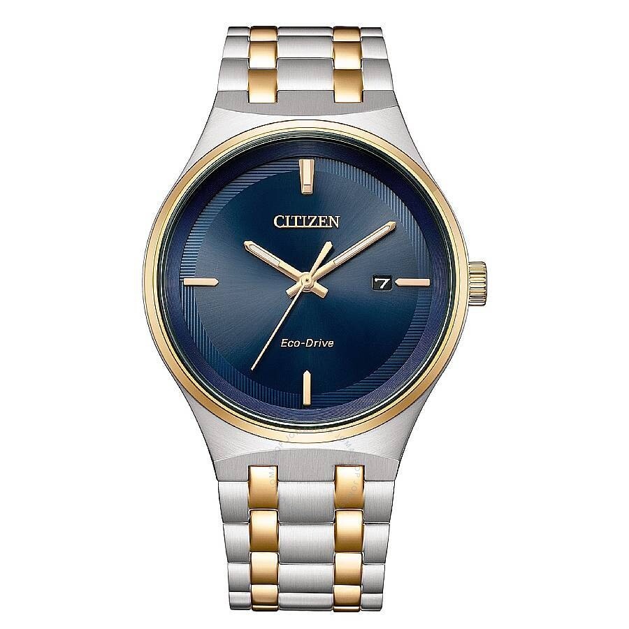 Silver-tone stainless steel case with a two-tone (silver-tone and rose gold-tone) stainless steel bracelet. Fixed rose gold-tone stainless steel bezel. Blue dial with rose gold-tone hands and index hour markers. Dial Type: Analog. Date display at the 3 o'clock position. Citizen Caliber Eco-Drive E111 eco-drive movement. Scratch resistant mineral crystal crystal. Pull / push crown. Solid case back. Round case shape, case size: 40 mm, case thickness: 9.25 mm. Fold over clasp with a safety release. Water resistant at 50 meters / 165 feet. Functions: date, hour, minute, second, solar-powered. Eco-drive Series. Dress watch style. Watch label: Japan Movt. Citizen Eco-Drive Blue Dial Men's Watch BM7656-51L. GENERAL Box Type: Original Box CASE Case Thickness: 9.25 mm Case Material: Stainless Steel Case Shape: Round Case Back: Solid BAND Band Material: Stainless Steel Band Type: Bracelet Band Color: Two-tone (Silver-tone and Rose Gold-tone) Clasp: Fold Over with Safety Release DIAL Dial Color: Blue Type: Analog Crystal: Mineral Crystal Hands: Rose Gold-tone Dial Markers: Index Bezel: Fixed Bezel Color: Rose Gold-tone Bezel Material: Stainless Steel Crown: Pull / Push INFORMATION Brand: Citizen Series: Eco-Drive Collection Name: Eco-Drive Gender: Mens Model: BM7656-51L Watch Label: Japan Movt Movement: Eco-Drive Engine: Citizen Caliber Eco-Drive E111 FEATURES Water Resistance: 50 meters / 165 feet Calendar: Date display at the 3 o'clock position Functions: Date, Hour, Minute, Second, Solar-powered Watch Features: Analog, Solar, Gold, Stainless Steel ADDITIONAL INFO Watch Style: Dress Warranty: 5 Year Jomashop Warranty Jomashop Sku: CZBM7656-51L Department: Watches