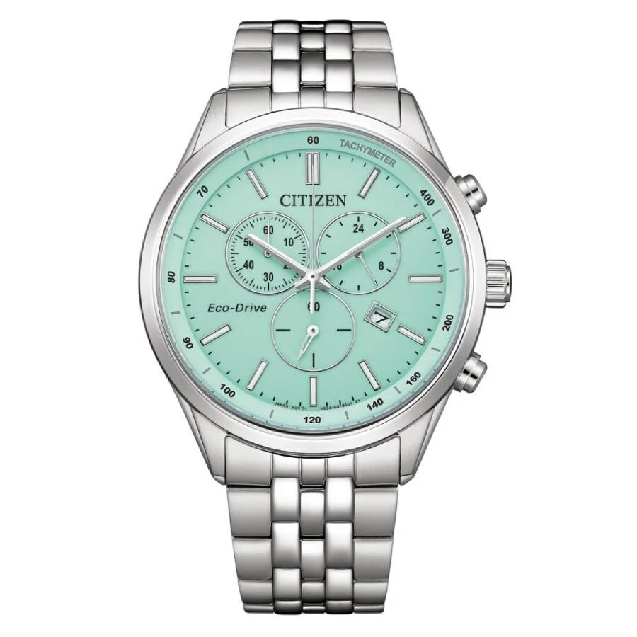 Silver-tone stainless steel case and bracelet. Fixed silver-tone stainless steel bezel. Blue dial with silver-tone hands and index hour markers. Minute markers around the outer rim. Dial Type: Analog. Date display at the 4 o'clock position. Chronograph - three sub-dials displaying: 60 second, 60 minute and 24 hour. Citizen Caliber Eco-Drive H504 eco-drive movement. Scratch resistant sapphire crystal. Solid case back. Round case shape, case size: 42 mm, case thickness: 10.5 mm. Water resistant at 100 meters / 330 feet. Functions: chronograph, date, hour, minute, second, solar-powered. Eco-drive Series. Sport watch style. Watch label: Japan Movt. Citizen Eco-Drive Chronograph Blue Dial Men's Watch AT2570-56M. GENERAL Box Type: Original Box CASE Case Diameter: 42 mm Case Thickness: 10.5 mm Case Material: Stainless Steel Case Shape: Round Case Back: Solid BAND Band Material: Stainless Steel Band Type: Bracelet Band Color: Silver-tone DIAL Dial Color: Blue Type: Analog Crystal: Scratch Resistant Sapphire Hands: Silver-tone Dial Markers: Index Second Markers: Minute Markers around the outer rim Sub Dials: Three - 60 Second, 60 Minute and 24 Hour Bezel: Fixed Bezel Color: Silver-tone Bezel Material: Stainless Steel INFORMATION Brand: Citizen Series: Eco-Drive Collection Name: Eco-Drive Gender: Mens Model: AT2570-56M Watch Label: Japan Movt Movement: Eco-Drive Engine: Citizen Caliber Eco-Drive H504 FEATURES Water Resistance: 100 meters / 330 feet Calendar: Date display at the 4 o'clock position Functions: Chronograph, Date, Hour, Minute, Second, Solar-powered Watch Features: Analog, Solar, Stainless Steel, Chronograph ADDITIONAL INFO Watch Style: Sport Warranty: 5 Year Jomashop Warranty Jomashop Sku: CZAT2570-56M Department: Watches