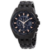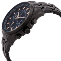 Black IP stainless steel case and bracelet. Fixed black IP stainless steel bezel. Black dial with rose gold-tone hands and index hour markers. Minute markers around the outer rim. Dial Type: Analog. Luminescent hands. Date display at the 3 o'clock position. perpetual calendar. Three sub-dials displaying: 12-24 hour, day of the week and power reserve indicator, 24 hour. Citizen Caliber Eco-Drive H820 eco-drive movement. Scratch resistant sapphire crystal. Screw down crown. Solid case back. Round case shape, case size: 44 mm, case thickness: 12.1 mm. Fold over clasp with a safety release. Water resistant at 200 meters / 660 feet. Functions: perpetual calendar, atomic timekeeping, radio controlled, world time, alarm, date, day, GMT, second time zone, hour, minute, second, power reserve indicator, solar-powered. Sport watch style. Watch label: Japan Movt. Citizen Eco-Drive Perpetual Alarm World Time GMT Black Dial Men's Watch AT9039-51L. GENERAL Box Type: Original Box CASE Case Diameter: 44 mm Case Thickness: 12.1 mm Case Material: Stainless Steel Case Shape: Round Case Back: Solid BAND Band Material: Stainless Steel Band Type: Bracelet Band Color: Black IP Clasp: Fold Over with Safety Release DIAL Dial Color: Black Type: Analog Crystal: Scratch Resistant Sapphire Hands: Rose Gold-tone Dial Markers: Index Second Markers: Minute Markers around the outer rim Sub Dials: Three - 12-24 Hour, Day of the Week and Power Reserve Indicator, 24 Hour Luminiscence: Hands Bezel: Fixed Bezel Color: Black IP Bezel Material: Stainless Steel Crown: Screw Down INFORMATION Brand: Citizen Gender: Mens Model: AT9039-51L Watch Label: Japan Movt Movement: Eco-Drive Engine: Citizen Caliber Eco-Drive H820 FEATURES Water Resistance: 200 meters / 660 feet Calendar: Date display at the 3 o'clock position. Perpetual Calendar Functions: Perpetual Calendar, Atomic Timekeeping, Radio Controlled, World Time, Alarm, Date, Day, GMT, Second Time Zone, Hour, Minute, Second, Power Reserve Indicator, Solar-powered Watch Features: Analog, GMT, Power Reserve Indicator, World Time, Solar, Perpetual, Gold, Stainless Steel, Atomic Timekeeping, Alarm, Time Zone ADDITIONAL INFO Watch Style: Sport Warranty: 5 Year Jomashop Warranty UPC Code: 4974374278852 Jomashop Sku: Z-SNURS Department: Watches Category: Watches