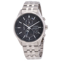Silver-tone stainless steel case and bracelet. Fixed silver-tone stainless steel bezel. Black dial with silver-tone hands and index hour markers. Minute markers around the outer rim. Dial Type: Analog. Date display at the 4 o'clock position. Three sub-dials displaying: moon phase, 24 hour and day. Citizen Caliber H874 eco-drive movement. Scratch resistant sapphire crystal. Solid case back. Round case shape, case size: 42 mm, case thickness: 10.7 mm. Deployment with push button release clasp. Water resistant at 100 meters / 330 feet. Functions: date, day, hour, minute, second, moon phase, perpetual calendar, global radio-controlled, 24 time zone world time, power reserve level indication. Eco-drive Series. Sport watch style. Watch label: Japan Movt. Citizen Eco-Drive Radio-Controlled Moon Phase Black Dial Men's Watch BY1030-50E. GENERAL Box Type: Original Box CASE Case Size: 42 Case Thickness: 10.7 mm Case Material: Stainless Steel Case Shape: Round Case Back: Solid BAND Band Material: Stainless Steel Band Type: Bracelet Band Color: Silver-tone Clasp: Deployment with Push Button Release DIAL Dial Color: Black Type: Analog Crystal: Scratch Resistant Sapphire Hands: Silver-tone Dial Markers: Index Second Markers: Minute Markers around the outer rim Sub Dials: Three - Moon Phase, 24 Hour and Day Bezel: Fixed Bezel Color: Silver-tone Bezel Material: Stainless Steel INFORMATION Brand: Citizen Series: Eco-Drive Collection Name: Eco-Drive Gender: Mens Model: BY1030-50E Watch Label: Japan Movt Movement: Eco-Drive Engine: Citizen Caliber H874 FEATURES Water Resistance: 100 meters / 330 feet Calendar: Date display at the 4 o'clock position Functions: Date, Day, Hour, Minute, Second, Moon Phase, Perpetual Calendar, Global Radio-Controlled, 24 Time Zone World Time, Power Reserve Level Indication Watch Features: Analog, World Time, Perpetual, Stainless Steel, Moon Phase, Time Zone ADDITIONAL INFO Watch Style: Sport Warranty: 5 Year Jomashop Warranty UPC Code: 4974374344120 Jomashop Sku: CZBY1030-50E Department: Watches