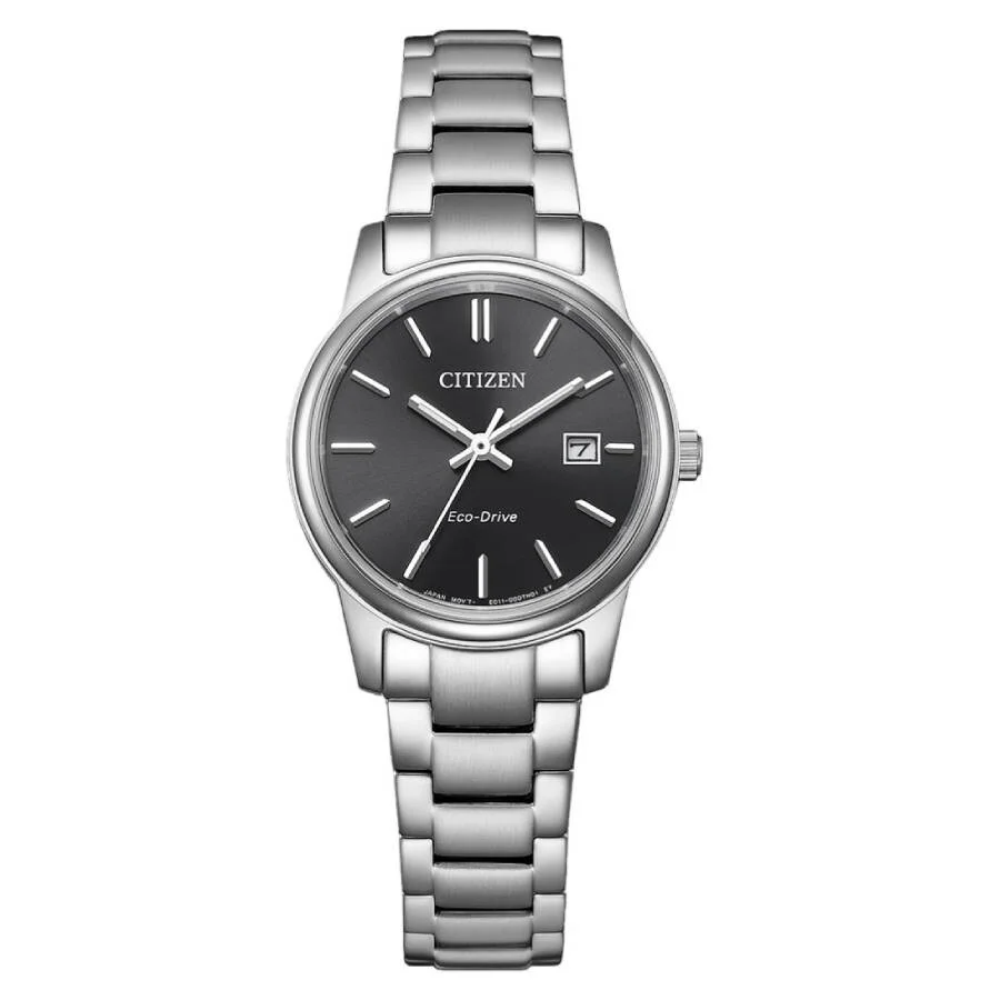 Silver-tone stainless steel case and bracelet. Fixed silver-tone stainless steel bezel. Black dial with silver-tone hands and index hour markers. Dial Type: Analog. Date display at the 3 o'clock position. Citizen Caliber Eco-Drive E011 eco-drive movement. Scratch resistant sapphire crystal. Pull / push crown. Solid case back. Round case shape, case size: 27.5 mm, case thickness: 7.4 mm. Fold over clasp with a safety release. Water resistant at 50 meters / 165 feet. Functions: date, hour, minute, second, solar-powered. Pair Series. Dress watch style. Watch label: Japan Movt. Citizen Pair Eco-Drive Black Dial Ladies Watch EW2318-90E. GENERAL Box Type: Original Box CASE Case Diameter: 27.5 mm Case Thickness: 7.4 mm Case Material: Stainless Steel Case Shape: Round Case Back: Solid BAND Band Material: Stainless Steel Band Type: Bracelet Band Color: Silver-tone Clasp: Fold Over with Safety Release DIAL Dial Color: Black Type: Analog Crystal: Scratch Resistant Sapphire Hands: Silver-tone Dial Markers: Index Bezel: Fixed Bezel Color: Silver-tone Bezel Material: Stainless Steel Crown: Pull / Push INFORMATION Brand: Citizen Series: Pair Collection Name: Pair Gender: Womens Model: EW2318-90E Watch Label: Japan Movt Movement: Eco-Drive Engine: Citizen Caliber Eco-Drive E011 FEATURES Water Resistance: 50 meters / 165 feet Calendar: Date display at the 3 o'clock position Functions: Date, Hour, Minute, Second, Solar-powered Watch Features: Analog, Solar, Stainless Steel ADDITIONAL INFO Watch Style: Dress Warranty: 5 Year Jomashop Warranty Jomashop Sku: CZEW2318-90E Department: Watches