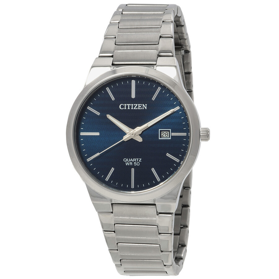 Stainless steel case with a stainless steel bracelet. Fixed stainless steel bezel. Blue dial with luminous silver-tone hands and index hour markers. Minute markers around the outer rim. Dial Type: Analog. Luminescent hands. Date display at the 3 o'clock position. Citizen caliber 8700 quartz movement. Scratch resistant mineral crystal. Pull / push crown. Solid case back. Round case shape. Case size: 39 mm. Case thickness: 8 mm. Band width: 20 mm. Fold over clasp with a push button release. Water resistant at 50 meters / 165 feet. Functions: date, hour, minute, second. Casual watch style. Citizen Quartz Blue Dial Stainless Steel Men's Watch BI5060-51L. CASE Case Size: 39 Case Thickness: 8 mm Case Material: Stainless Steel Case Shape: Round Case Back: Solid BAND Band Material: Stainless Steel Band Type: Bracelet Band Color: Silver-tone Band Width: 20 mm Clasp: Fold Over with Push Button Release DIAL Dial Color: Blue Type: Analog Crystal: Scratch Resistant Mineral Hands: Luminous Silver-tone Dial Markers: Index Second Markers: Minute Markers around the outer rim Luminiscence: Hands Bezel: Fixed Bezel Color: Silver-tone Bezel Material: Stainless Steel Crown: Pull / Push INFORMATION Brand: Citizen Gender: Mens Model: BI5060-51L Movement: Quartz Engine: Citizen Caliber 8700 FEATURES Water Resistance: 50 meters / 165 feet Calendar: Date display at the 3 o'clock position Functions: Date, Hour, Minute, Second Watch Features: Stainless Steel, Analog ADDITIONAL INFO Watch Style: Casual Warranty: 5 Year Jomashop Warranty UPC Code: 4974374275226 Jomashop Sku: CZBI5060-51L Department: Watches Category: Watches