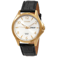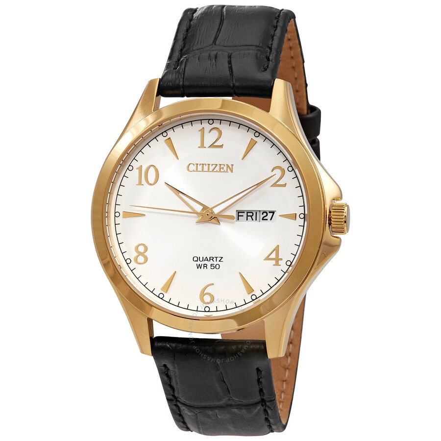 Gold-tone stainless steel case with a black leather strap. Fixed gold-tone bezel. Silver dial with luminous gold-tone hands and alternating Arabic numeral and index hour markers. Minute markers around the outer rim. Dial Type: Analog. Luminescent hands and markers. Day of the week and date display at the 3 o'clock position. Citizen caliber 1502 quartz movement. Scratch resistant mineral crystal. Pull / push crown. Solid case back. Round case shape. Case size: 41 mm. Case thickness: 8.8 mm. Band width: 20 mm. Tang clasp. Water resistant at 50 meters / 165 feet. Functions: date, day, hour, minute, second. Casual watch style. Watch label: Japan Movt. Citizen Quartz Silver Dial Black Leather Men's Watch BF2003-25A. INFORMATION Brand: Citizen Gender: Mens Model: BF2003-25A Watch Label: Japan Movt Movement: Quartz Engine: Citizen Caliber 1502 CASE Case Size: 41 mm Case Thickness: 8.8 mm Case Material: Stainless Steel Case Shape: Round Case Back: Solid BAND Band Material: Leather Band Type: Strap Band Color: Black Band Width: 20 mm Clasp: Tang DIAL Dial Color: Silver Type: Analog Crystal: Scratch Resistant Mineral Hands: Luminous Gold-tone Dial Markers: Alternating Arabic Numeral and Index Second Markers: Minute Markers around the outer rim Luminiscence: Hands and Markers Bezel: Fixed Bezel Color: Gold-tone Bezel Material: Stainless Steel Crown: Pull / Push FEATURES Water Resistance: 50 meters / 165 feet Calendar: Day of the Week and Date display at the 3 o'clock position Functions: Date, Day, Hour, Minute, Second Watch Features: Stainless Steel, Leather, Gold, Analog ADDITIONAL INFO Watch Style: Casual Warranty: 5 Year Jomashop Warranty UPC Code: 4974374285348 Jomashop Sku: CZBF2003-25A Department: Watches Category: Watches