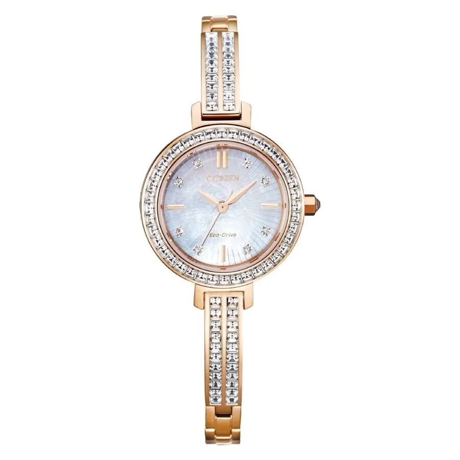 Rose gold-tone stainless steel case with a rose gold-tone stainless steel bracelet set with crystals. Fixed rose gold-tone stainless steel bezel set with crystals. Mother of pearl dial with rose gold-tone hands and crystal-index hour markers. Index markers appear at the 3, 6, 9 and 12 o'clock position. Minute markers around the outer rim. Dial Type: Analog. Citizen Caliber Eco-Drive E031 eco-drive movement. Scratch resistant mineral crystal. Pull / push crown. Solid case back. Round case shape, case size: 25 mm. Band width: 6 mm. Jewelry clasp. Water resistant at 50 meters / 165 feet. Functions: hour, minute, second, solar-powered. Silhouette Crystal Series. Dress watch style. Watch label: Japan Movt. Citizen Silhouette Crystal Eco-Drive Ladies Watch EM0863-53D. GENERAL Box Type: Original Box CASE Case Material: Stainless Steel Case Shape: Round Case Back: Solid BAND Band Material: Stainless Steel set with Crystals Band Type: Bracelet Band Color: Rose Gold-tone Band Width: 6 mm Clasp: Jewelry DIAL Dial Color: Mother of Pearl Type: Analog Crystal: Scratch Resistant Mineral Hands: Rose Gold-tone Dial Markers: Crystal-Index Second Markers: Index Markers appear at the 3, 6, 9 and 12 o'clock position. Minute Markers around the outer rim Bezel: Fixed Bezel Color: Rose Gold-tone Bezel Material: Stainless Steel set with Crystals Crown: Pull / Push INFORMATION Brand: Citizen Series: Silhouette Crystal Collection Name: Silhouette Crystal Gender: Womens Model: EM0863-53D Watch Label: Japan Movt Movement: Eco-Drive Engine: Citizen Caliber Eco-Drive E031 FEATURES Water Resistance: 50 meters / 165 feet Functions: Hour, Minute, Second, Solar-powered Watch Features: Analog, Solar, Gold, Stainless Steel ADDITIONAL INFO Watch Style: Dress Warranty: 5 Year Jomashop Warranty UPC Code: 4974374299130 Jomashop Sku: CZEM0863-53D Department: Watches