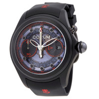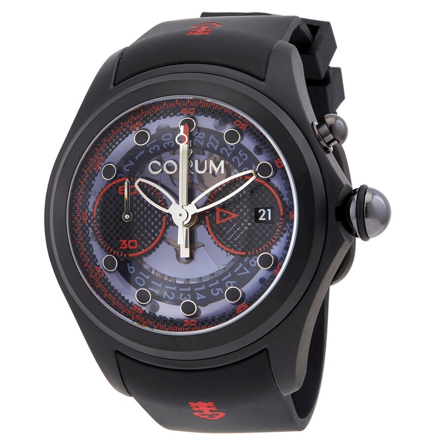 Black PVD titanium grade 5 case with a black rubber strap. Fixed black PVD titanium grade 5 bezel. Blue skeleton dial with silver-tone leaf-style hands and dot hour markers. Minute markers around the outer rim. Dial Type: Analog. Date display at the 3 o'clock position. Chronograph - two sub-dials displaying: 60 second and 30 minute. Corum calibre CO 961 automatic movement, containing 28 Jewels, bitting at 28800 vph, and has a power reserve of approximately 42 hours. Scratch resistant sapphire crystal. Pull / push crown. Transparent case back. Round case shape. Case size: 52 mm. Case thickness: 20.2 mm. Band width: 26 mm. Tang clasp. Water resistant at 100 meters / 330 feet. Functions: chronograph, monopoussoir, date, hour, minute, second, chronometer. Big Bubble Series. Luxury watch style. Watch label: Swiss Made. Item Variations: L961/03309. Corum Big Bubble Chronograph Automatic Chronometer Men's Watch 961.201.95/0371 CT01. INFORMATION Brand: Corum Series: Big Bubble Collection Name: Big Bubble Gender: Mens Model: 961.201.95/0371 CT01 Watch Label: Swiss Made Movement: Automatic Engine: Corum Calibre CO 961 Power Reserve: 42 hours CASE Case Size: 52 mm Case Thickness: 20.2 mm Case Material: Titanium Grade 5 Case Shape: Round Case Back: Transparent BAND Band Material: Rubber Band Type: Strap Band Color: Black Band Width: 26 mm Clasp: Tang DIAL Dial Color: Blue Skeleton Type: Analog Crystal: Scratch Resistant Sapphire Hands: Silver-tone Leaf-style Dial Markers: Dot Second Markers: Minute Markers around the outer rim Sub Dials: Two - 60 Second and 30 Minute Bezel: Fixed Bezel Color: Black PVD Bezel Material: Titanium Grade 5 Crown: Pull / Push FEATURES Water Resistance: 100 meters / 330 feet Calendar: Date display at the 3 o'clock position Functions: Chronograph, Monopoussoir, Date, Hour, Minute, Second, Chronometer Watch Features: Chronograph, Titanium, Rubber, Chronometer, Analog ADDITIONAL INFO Watch Style: Luxury Warranty: 2 Year Jomashop Warranty UPC Code: 842047181997 Jomashop Sku: CM961201950371CT01 Item Variation: L961/03309 Department: Watches Category: Watches