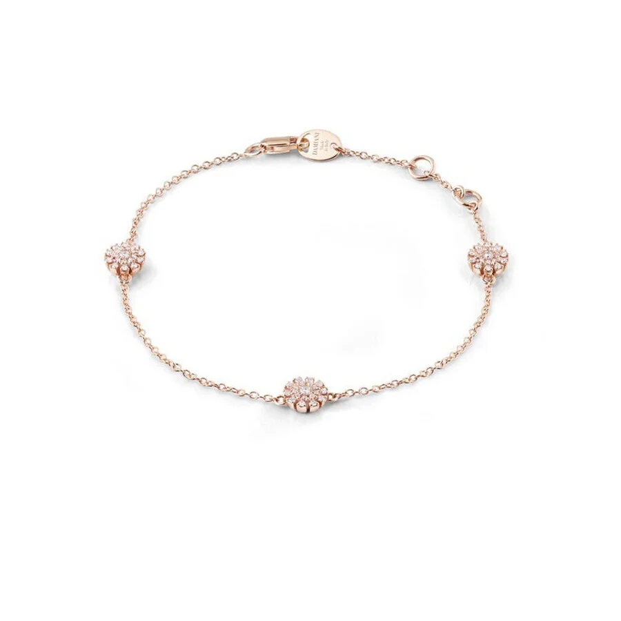 Damiani Ladies Bracelets. Margherita series. SKU: 20089268. Metal Type: Rose Gold. Metal Stamp: 18k. Gem stone type: Diamond. The Margherita bracelet showcases three delicate flower motifs crafted in 18K rose gold, each measuring 6 mm in size. Adorned with round brilliant-cut diamonds totaling approximately 0.31 carats, this elegant piece captures a refined floral charm with timeless sparkle. Length: 18 cm. GENERAL Collection Name: Margherita INFORMATION Brand: Damiani Series: Margherita Gender: Womens Model: 20089268 DETAILS Ring Style: Fashion Material : Rose Gold Metal Stamp: 18K Stone Type: Diamond Stone Weight: 0.31 ADDITIONAL INFO Jomashop Sku: Z-9H884 Department: Jewelry Category: Bracelets
