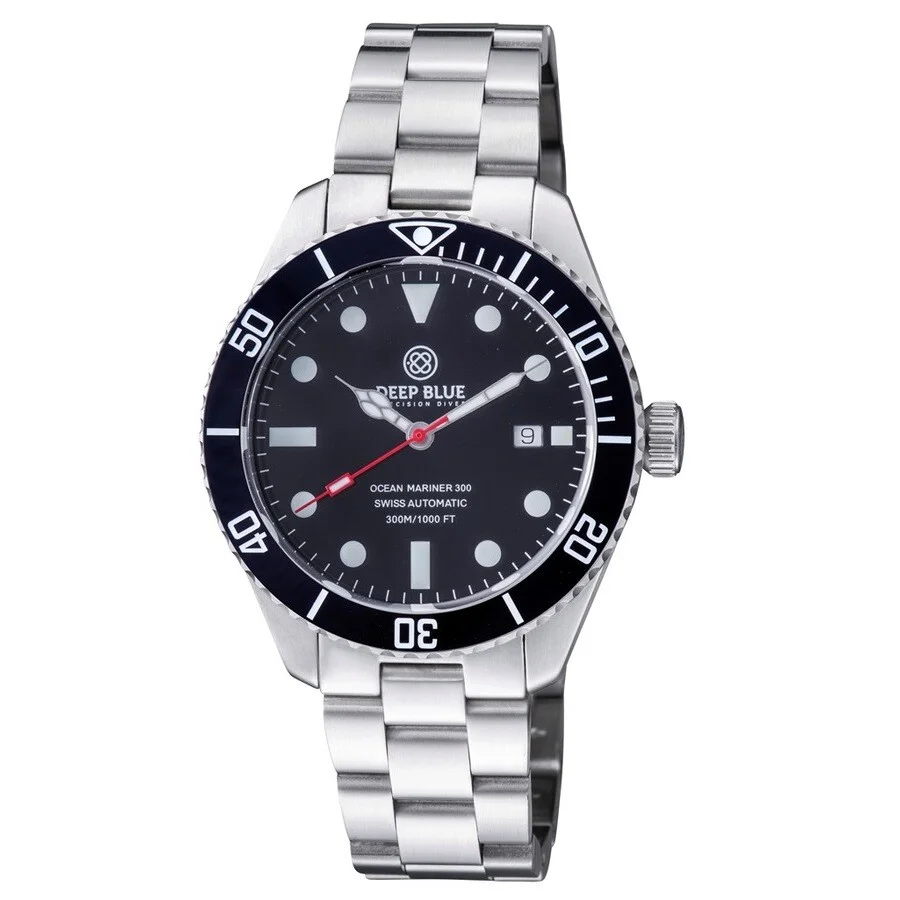 Silver-tone stainless steel case and bracelet. Uni-directional rotating black ceramic bezel. Black dial with silver-tone hands and index hour markers. Minute scale around the inner rim. Dial Type: Analog. Luminescent hands and markers. Date display at the 3 o'clock position. Sellita Caliber SW 200-1 Automatic movement, based upon Sellita SW 200, containing 26 Jewels, bitting at 28800 vph, and has a power reserve of approximately 38 hours. Scratch resistant sapphire crystal. Screw down crown. Solid case back. Round case shape, case size: 42 mm, case thickness: 12 mm. Band width: 20 mm, band length: 8.5 inches. Deployment with push button release clasp. Water resistant at 300 meters / 1000 feet. Functions: date, minute, second. Ocean Mariner 300 Series. Dive watch style. Watch label: Swiss Automatic. Deep Blue Ocean Mariner 300 Automatic Black Dial Men's Watch OMRN300BLK. GENERAL Box Type: Original Box CASE Case Thickness: 12 mm Case Material: Stainless Steel Case Shape: Round Case Back: Solid BAND Band Material: Stainless Steel Band Type: Bracelet Band Color: Silver-tone Band Length: 8.5 inches Band Width: 20 mm Clasp: Deployment with Push Button Release DIAL Dial Color: Black Type: Analog Crystal: Scratch Resistant Sapphire Hands: Silver-tone Dial Markers: Index Second Markers: Minute Scale around the inner rim Luminiscence: Hands and Markers Bezel: Uni-directional Rotating Bezel Color: Black Bezel Material: Ceramic Crown: Screw Down INFORMATION Brand: Deep Blue Series: Ocean Mariner 300 Collection Name: Ocean Mariner 300 Gender: Mens Model: OMRN300BLK Watch Label: Swiss Automatic Movement: Automatic Engine: Sellita Caliber SW 200-1 Power Reserve: 38 hours FEATURES Water Resistance: 300 meters / 1000 feet Calendar: Date Display at the 3 o'clock position Functions: Date, Minute, Second Watch Features: Analog, Ceramic, Stainless Steel ADDITIONAL INFO Watch Style: Dive Warranty: With Manufacturers Guarantee Jomashop Sku: DPB321731 Department: Watches
