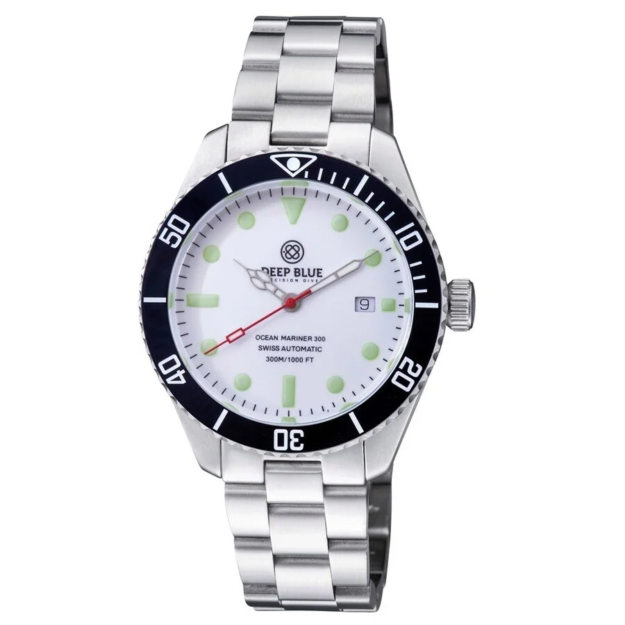 Silver-tone stainless steel case and bracelet. Uni-directional rotating black ceramic bezel. White dial with silver-tone hands and index hour markers. Minute scale around the inner rim. Dial Type: Analog. Luminescent hands and markers. Date display at the 3 o'clock position. Automatic movement. Scratch resistant sapphire crystal. Screw down crown. Solid case back. Round case shape, case size: 42 mm, case thickness: 12 mm. Deployment with push button release clasp. Water resistant at 300 meters / 1000 feet. Functions: date, hour, minute, second. Additional Info: Swiss automatic. Ocean Mariner 300 Series. Dive watch style. Deep Blue Ocean Mariner 300 Automatic White Dial Men's Watch OMRN300WHT. GENERAL Box Type: Original Box CASE Case Thickness: 12 mm Case Material: Stainless Steel Case Shape: Round Case Back: Solid BAND Band Material: Stainless Steel Band Type: Bracelet Band Color: Silver-tone Clasp: Deployment with Push Button Release DIAL Dial Color: White Type: Analog Crystal: Scratch Resistant Sapphire Hands: Silver-tone Dial Markers: Index Second Markers: Minute Scale around the inner rim Luminiscence: Hands and Markers Bezel: Uni-directional Rotating Bezel Color: Black Bezel Material: Ceramic Crown: Screw Down INFORMATION Brand: Deep Blue Series: Ocean Mariner 300 Collection Name: Ocean Mariner 300 Gender: Mens Model: OMRN300WHT Movement: Automatic FEATURES Water Resistance: 300 meters / 1000 feet Calendar: Date Display at the 3 o'clock position Functions: Date, Hour, Minute, Second Watch Features: Analog, Ceramic, Stainless Steel ADDITIONAL INFO Watch Style: Dive Warranty: With Manufacturers Guarantee Additional Info: SWISS AUTOMATIC Jomashop Sku: DPB321728 Department: Watches