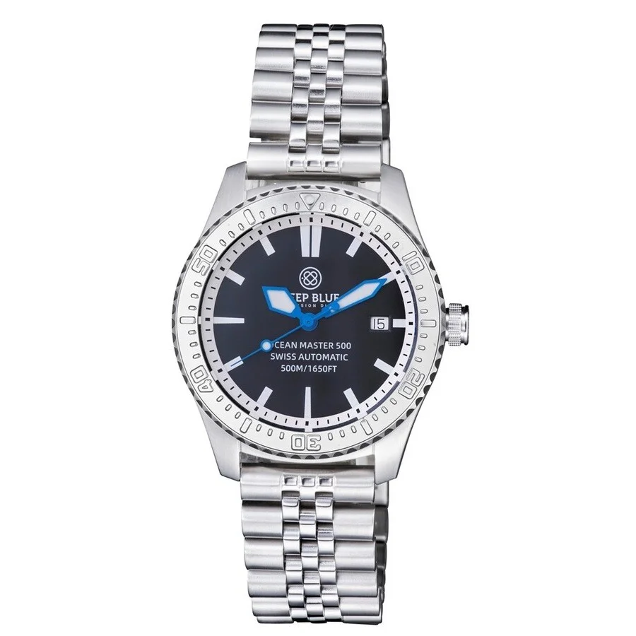 Silver-tone stainless steel case and bracelet. Uni-directional rotating silver-tone stainless steel bezel. Black dial with blue hands and index hour markers. Minute scale around the inner rim. Dial Type: Analog. Luminescent hands and markers. Date display at the 3 o'clock position. Automatic movement. Scratch resistant sapphire crystal. Screw down crown. Solid case back. Round case shape, case size: 40 mm. Deployment with push button release clasp. Water resistant at 500 meters / 1650 feet. Functions: date, hour, minute, second. Ocean Master 500 Series. Dive watch style. Deep Blue Ocean Master 500 Automatic Black Dial Men's Watch OM500BLKBLUINNERBRCJUB. GENERAL Box Type: Original Box CASE Case Material: Stainless Steel Case Shape: Round Case Back: Solid BAND Band Material: Stainless Steel Band Type: Bracelet Band Color: Silver-tone Clasp: Deployment with Push Button Release DIAL Dial Color: Black Type: Analog Crystal: Scratch Resistant Sapphire Hands: Blue Dial Markers: Index Second Markers: Minute Scale around the inner rim Luminiscence: Hands and Markers Bezel: Uni-directional Rotating Bezel Color: Silver-tone Bezel Material: Stainless Steel Crown: Screw Down INFORMATION Brand: Deep Blue Series: Ocean Master 500 Collection Name: Ocean Master 500 Gender: Mens Model: OM500BLKBLUINNERBRCJUB Movement: Automatic FEATURES Water Resistance: 500 meters / 1650 feet Calendar: Date Display at the 3 o'clock position Functions: Date, Hour, Minute, Second Watch Features: Stainless Steel, Analog ADDITIONAL INFO Watch Style: Dive Warranty: With Manufacturers Guarantee Jomashop Sku: DPB323286 Department: Watches