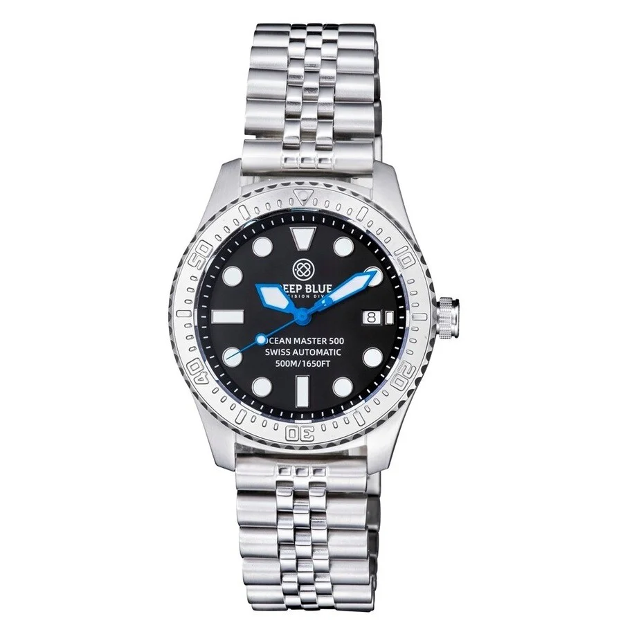 Silver-tone stainless steel case and bracelet. Uni-directional rotating silver-tone stainless steel bezel. Black dial with blue hands and index hour markers. Minute scale around the inner rim. Dial Type: Analog. Luminescent hands and markers. Date display at the 3 o'clock position. Automatic movement. Scratch resistant sapphire crystal. Screw down crown. Solid case back. Round case shape, case size: 40 mm. Deployment with push button release clasp. Water resistant at 500 meters / 1650 feet. Functions: date, hour, minute, second. Ocean Master 500 Series. Dive watch style. Deep Blue Ocean Master 500 Automatic Black Dial Men's Watch OM500BLKBLURNDHRBRCLTJUB. GENERAL Box Type: Original Box CASE Case Material: Stainless Steel Case Shape: Round Case Back: Solid BAND Band Material: Stainless Steel Band Type: Bracelet Band Color: Silver-tone Clasp: Deployment with Push Button Release DIAL Dial Color: Black Type: Analog Crystal: Scratch Resistant Sapphire Hands: Blue Dial Markers: Index Second Markers: Minute Scale around the inner rim Luminiscence: Hands and Markers Bezel: Uni-directional Rotating Bezel Color: Silver-tone Bezel Material: Stainless Steel Crown: Screw Down INFORMATION Brand: Deep Blue Series: Ocean Master 500 Collection Name: Ocean Master 500 Gender: Mens Model: OM500BLKBLURNDHRBRCLTJUB Movement: Automatic FEATURES Water Resistance: 500 meters / 1650 feet Calendar: Date Display at the 3 o'clock position Functions: Date, Hour, Minute, Second Watch Features: Stainless Steel, Analog ADDITIONAL INFO Watch Style: Dive Warranty: With Manufacturers Guarantee Jomashop Sku: DPB323267 Department: Watches