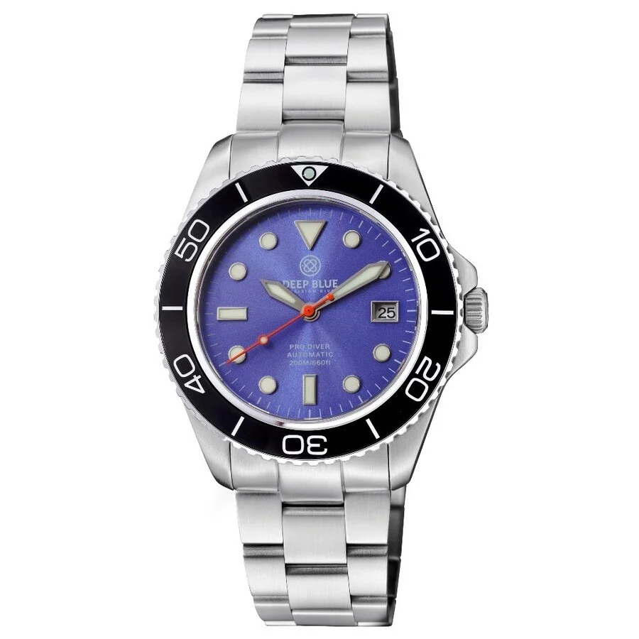 Silver-tone stainless steel case and bracelet. Uni-directional rotating black ceramic bezel. Purple dial with silver-tone hands and index hour markers. Minute scale around the inner rim. Dial Type: Analog. Luminescent hands and markers. Date display at the 3 o'clock position. SII Caliber NH35A Automatic movement, containing 24 Jewels, bitting at 21600 vph, and has a power reserve of approximately 41 hours. Scratch resistant sapphire crystal. Screw down crown. Solid case back. Round case shape, case size: 42.5 mm, case thickness: 12 mm. Band width: 22 mm, band length: 8.5 inches. Deployment with push button release clasp. Water resistant at 200 meters / 660 feet. Functions: date, hour, minute, second. Additional Info: pro diver watch. Pro Diver 200 Series. Dive watch style. Watch label: Japan Movt. Deep Blue Pro Diver 200 Automatic Purple Dial Men's Watch PD200LAVAND. GENERAL Box Type: Original Box CASE Case Thickness: 12 mm Case Material: Stainless Steel Case Shape: Round Case Back: Solid BAND Band Material: Stainless Steel Band Type: Bracelet Band Color: Silver-tone Band Length: 8.5 inches Band Width: 22 mm Clasp: Deployment with Push Button Release DIAL Dial Color: Purple Type: Analog Crystal: Scratch Resistant Sapphire Hands: Silver-tone Dial Markers: Index Second Markers: Minute Scale around the inner rim Luminiscence: Hands and Markers Bezel: Uni-directional Rotating Bezel Color: Black Bezel Material: Ceramic Crown: Screw Down INFORMATION Brand: Deep Blue Series: Pro Diver 200 Collection Name: Pro Diver 200 Gender: Mens Model: PD200LAVAND Watch Label: Japan Movt Movement: Automatic Engine: SII Caliber NH35A Power Reserve: 41 hours FEATURES Water Resistance: 200 meters / 660 feet Calendar: Date Display at the 3 o'clock position Functions: Date, Hour, Minute, Second Watch Features: Analog, Ceramic, Stainless Steel ADDITIONAL INFO Watch Style: Dive Warranty: With Manufacturers Guarantee Additional Info: Pro Diver Watch Jomashop Sku: DPB321716 Department: Watches