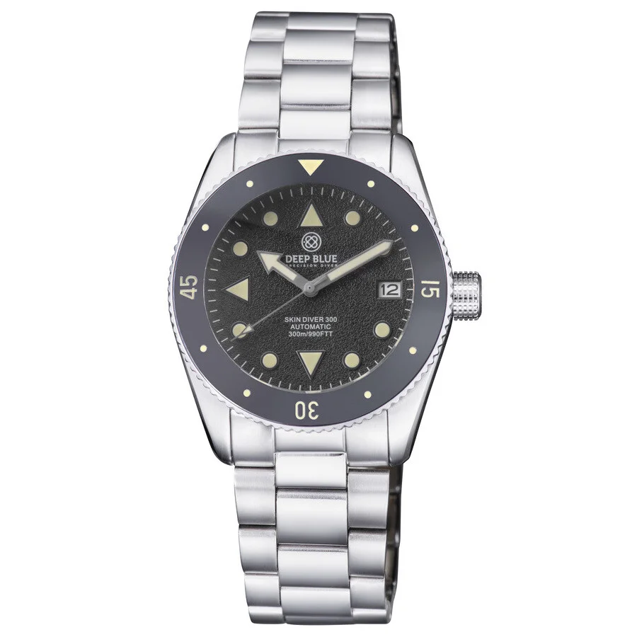 Silver-tone stainless steel case and bracelet. Uni-directional rotating black ceramic bezel. Black dial with silver-tone hands and index hour markers. Minute scale around the inner rim. Dial Type: Analog. Luminescent hands and markers. Date display at the 3 o'clock position. Automatic movement. Scratch resistant sapphire crystal. Screw down crown. Solid case back. Round case shape, case size: 40 mm. Deployment with push button release clasp. Water resistant at 300 meters / 1000 feet. Functions: date, hour, minute, second. Skin Diver 300 Series. Dive watch style. Deep Blue Skin Diver 300 Automatic Black Dial Men's Watch SKINDVRARW. GENERAL Box Type: Original Box CASE Case Material: Stainless Steel Case Shape: Round Case Back: Solid BAND Band Material: Stainless Steel Band Type: Bracelet Band Color: Silver-tone Clasp: Deployment with Push Button Release DIAL Dial Color: Black Type: Analog Crystal: Scratch Resistant Sapphire Hands: Silver-tone Dial Markers: Index Second Markers: Minute Scale around the inner rim Luminiscence: Hands and Markers Bezel: Uni-directional Rotating Bezel Color: Black Bezel Material: Ceramic Crown: Screw Down INFORMATION Brand: Deep Blue Series: Skin Diver 300 Collection Name: Skin Diver 300 Gender: Mens Model: SKINDVRARW Movement: Automatic FEATURES Water Resistance: 300 meters / 1000 feet Calendar: Date Display at the 3 o'clock position Functions: Date, Hour, Minute, Second Watch Features: Analog, Ceramic, Stainless Steel ADDITIONAL INFO Watch Style: Dive Warranty: With Manufacturers Guarantee Jomashop Sku: DPB321727 Department: Watches