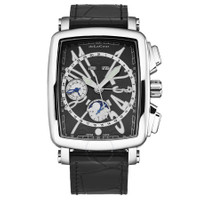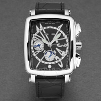 Silver-tone stainless steel case with a black leather strap. Fixed silver-tone stainless steel bezel. Black dial with silver-tone hands and Arabic numeral hour markers. Minute markers around the outer rim. Dial Type: Analog. Luminescent hands and markers. Complete calendar. Three sub-dials displaying: 24 hour, 30 minute and 1/10th of a second/moonphase. ETA-Valjoux Caliber 7751 Automatic movement, based upon ETA 7750, containing 25 Jewels, bitting at 28800 vph, and has a power reserve of approximately 44 hours. Scratch resistant sapphire crystal. Pull / push crown. Transparent see through case back. Rectangle case shape, case size: 38 mm, case thickness: 15 mm. Band width: 22 mm, band length: 8 inches. Buckle clasp. Water resistant at 30 meters / 100 feet. Functions: full calendar, moon phase, chronograph, month, date, day, GMT, second time zone, hour, minute, small second, day/night indicator. Vialarga Series. Luxury watch style. Watch label: Swiss Made. DeLaCour ViaLarga Chronograph Automatic Black Dial Men's Watch WAST1026-BLK. INFORMATION Brand: Delacour Series: Vialarga Collection Name: ViaLarga Gender: Mens Model: WAST1026-BLK Watch Label: Swiss Made Movement: Automatic Engine: ETA-Valjoux Caliber 7751 Power Reserve: 44 hours CASE Case Size: 38 mm Case Thickness: 15 mm Case Material: Stainless Steel Case Shape: Rectangle Case Back: Transparent See Through BAND Band Material: Leather Band Type: Strap Band Color: Black Band Length: 8 inches Band Width: 22 mm Clasp: Buckle DIAL Dial Color: Black Type: Analog Crystal: Scratch Resistant Sapphire Hands: Silver-tone Dial Markers: Arabic Numeral Second Markers: Minute Markers around the outer rim Sub Dials: Three - 24 Hour, 30 Minute and 1/10th of a Second/Moonphase Luminiscence: Hands and Markers Bezel: Fixed Bezel Color: Silver-tone Bezel Material: Stainless Steel Crown: Pull / Push FEATURES Water Resistance: 30 meters / 100 feet Calendar: Complete Calendar Functions: Full Calendar, Moon Phase, Chronograph, Month, Date, Day, GMT, Second Time Zone, Hour, Minute, Small Second, Day/Night Indicator Watch Features: Analog, GMT, Day/Night Indicator, Month, Leather, Stainless Steel, Moon Phase, Chronograph, Time Zone ADDITIONAL INFO Watch Style: Luxury Jomashop Sku: Y-173486 Department: Watches Category: Watches