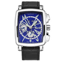 Silver-tone stainless steel case with a black leather strap. Fixed silver-tone stainless steel bezel. Blue dial with silver-tone hands and Arabic numeral hour markers. Minute markers around the outer rim. Dial Type: Analog. Day / date / month. Three sub-dials displaying: 24 hour, 30 minute and 1/10th of a second/moonphase. ETA-Valjoux Caliber 7751 Automatic movement, based upon ETA 7750, containing 25 Jewels, bitting at 28800 vph, and has a power reserve of approximately 44 hours. Scratch resistant sapphire crystal. Pull / push crown. Transparent case back. Rectangle case shape, case size: 38 mm, case thickness: 15 mm. Band width: 22 mm, band length: 8 inches. Tang clasp. Water resistant at 30 meters / 100 feet. Functions: full calendar, moon phase, chronograph, month, date, day, GMT, second time zone, hour, minute, small second, day/night indicator. Additional Info: hours, minutes, small seconds, day, date, month, moonphase, chronograph, 24 hour indicator. Vialarga Series. Luxury watch style. DeLaCour Vialarga Chronograph GMT Automatic Moon Phase Day-Night Blue Dial Men's Watch WAST1026-BLU. CASE Case Size: 38 Case Thickness: 15 mm Case Material: Stainless Steel Case Shape: Rectangle Case Back: Transparent BAND Band Material: Leather Band Type: Strap Band Color: Black Band Length: 8 inches Band Width: 22 mm Clasp: Tang DIAL Dial Color: Blue Type: Analog Crystal: Scratch Resistant Sapphire Hands: Silver-tone Dial Markers: Arabic Numeral Second Markers: Minute Markers around the outer rim Sub Dials: Three - 24 Hour, 30 Minute and 1/10th of a Second/Moonphase Luminiscence: Hands and Markers Bezel: Fixed Bezel Color: Silver-tone Bezel Material: Stainless Steel Crown: Pull / Push INFORMATION Brand: Delacour Series: Vialarga Collection Name: Vialarga Gender: Mens Model: WAST1026-BLU Watch Label: Swiss Made Movement: Automatic Engine: ETA-Valjoux Caliber 7751 Power Reserve: 44 hours FEATURES Water Resistance: 30 meters / 100 feet Calendar: Day / Date / Month Functions: Full Calendar, Moon Phase, Chronograph, Month, Date, Day, GMT, Second Time Zone, Hour, Minute, Small Second, Day/Night Indicator Watch Features: Analog, GMT, Day/Night Indicator, Month, Leather, Stainless Steel, Moon Phase, Chronograph, Time Zone ADDITIONAL INFO Watch Style: Luxury Additional Info: Hours, Minutes, Small Seconds, Day, Date, Month, Moonphase, Chronograph, 24 Hour Indicator Jomashop Sku: Y-A4K9U Department: Watches