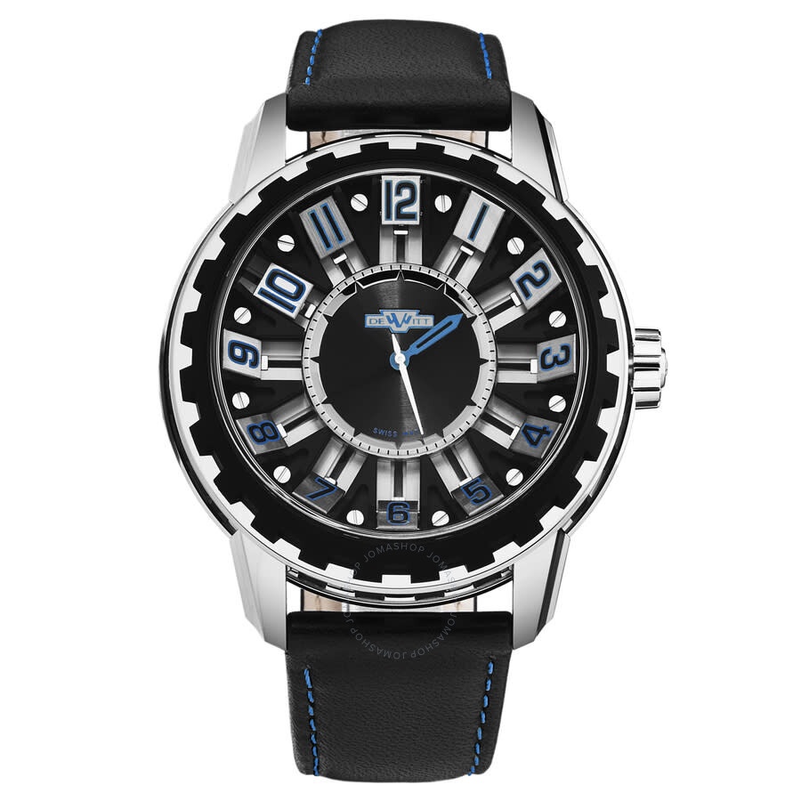 Titanium case with a black leather strap. Fixed black titanium bezel. Black dial with blue hands and Arabic numeral hour markers. Minute scale around the inner rim. Dial Type: Analog. Automatic movement. Scratch resistant sapphire crystal. Pull / push crown. Transparent case back. Round case shape, case size: 49.2 mm, case thickness: 15.3 mm. Band width: 23 mm, band length: 8 inches. Fold over clasp. Water resistant at 30 meters / 100 feet. Functions: hour, minute, second. Additional Info: 3D hours, minutes, seconds. Academia Series. Luxury watch style. DeWitt Academia Automatic Black Dial Men's Watch AC.SLD.001 RPB. INFORMATION Brand: Dewitt Series: Academia Collection Name: Academia Gender: Mens Model: AC.SLD.001 RPB Movement: Automatic CASE Case Size: 49.2 mm Case Thickness: 15.3 mm Case Material: Titanium Case Shape: Round Case Back: Transparent BAND Band Material: Leather Band Type: Strap Band Color: Black Band Length: 8 inches Band Width: 23 mm Clasp: Fold Over DIAL Dial Color: Black Type: Analog Crystal: Scratch Resistant Sapphire Hands: Blue Dial Markers: Arabic Numeral Second Markers: Minute Scale around the inner rim Bezel: Fixed Bezel Color: Black Bezel Material: Titanium Crown: Pull / Push FEATURES Water Resistance: 30 meters / 100 feet Functions: Hour, Minute, Second Watch Features: Titanium, Leather, Analog ADDITIONAL INFO Watch Style: Luxury Warranty: 2 Year Jomashop Warranty Additional Info: 3D Hours, minutes, seconds. Jomashop Sku: DEACACSLD001RPB Department: Watches Category: Watches