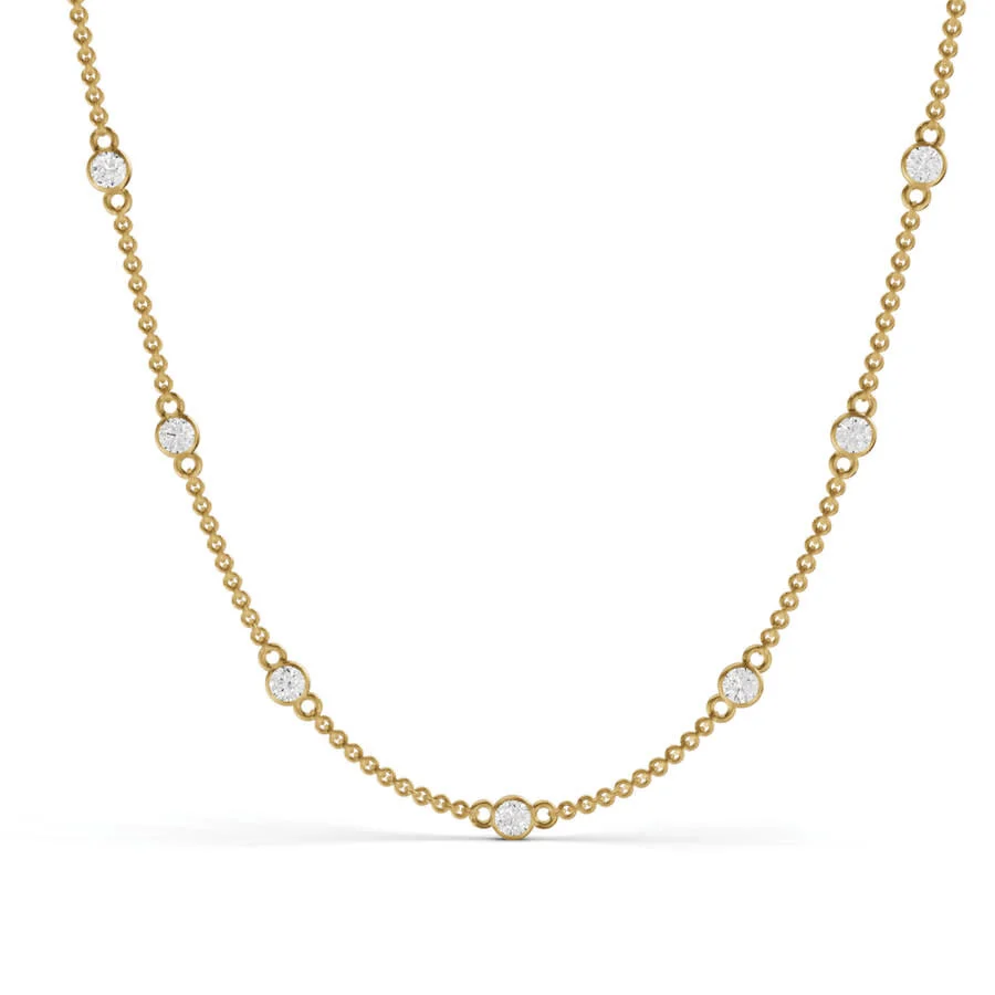 Radiant and sophisticated, this station necklace is crafted from 14K yellow gold and features lab-grown diamonds totaling 1.50 carats. Each diamond, graded E-F color and VS1–VS2 clarity, is set in a smooth bezel that enhances its brilliance while providing a sleek, contemporary look. GENERAL Stone Shape: Round Color: Yellow INFORMATION Brand: Diamond2Deal Gender: Womens Model: D2DN70016-150C-DBY-14Y DETAILS Size Info: 18 inches Necklaces: Tennis Ring Style: Fashion Chain Type: Link Closure Type: Lobster Material : Yellow Gold Metal Stamp: 14K Stone Type: Diamond Stone Weight: 1.5 Stone Color: E-F Stone Cut: Round Stone Clarity: VS1-VS2 Stone Origin: Lab Grown Total Stones: 10 ADDITIONAL INFO Jomashop Sku: Y-A5LEM Department: Jewelry Category: Necklaces