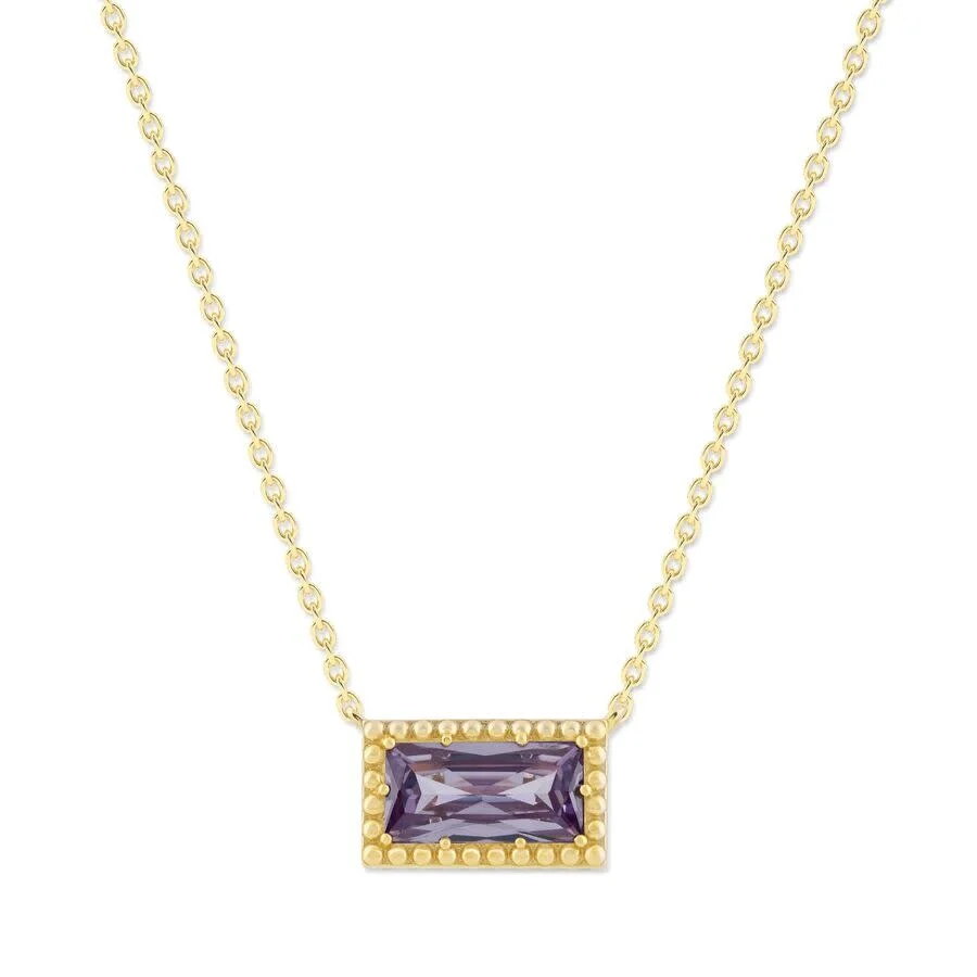 Showcasing a sleek baguette-cut alexandrite, this pendant delivers modern elegance with a refined edge. The 14K gold plated sterling silver setting enhances the stone’s unique color-shifting charm, creating a sophisticated statement that’s easy to layer or wear solo. Perfect for birthdays or celebrations, this June birthstone necklace comes beautifully packaged in a gift box. DiamondMuse Ladies Necklaces. SKU: UDN0055W-DYALX. Color: Purple. Metal Type: Sterling Silver. Metal Stamp: 925-Sterling. Metal Weight: 3.28g. Gem stone type: Alexandrite. Number of stones: 1. Stone color: Purple. Necklace style: Pendant. Chain type: Cable. Closure type: Spring Ring. DiamondMuse Belacqua Alexandrite June Birthstone Baguette Pendant Necklace in 14K Gold Plated Sterling Silver. GENERAL Color: Purple INFORMATION Brand: Diamondmuse Gender: Womens Model: UDN0055W-DYALX DETAILS Size Info: 18 inches Necklaces: Pendant Ring Style: Fashion Chain Type: Cable Closure Type: Spring Ring Material : Sterling Silver Metal Stamp: 925-Sterling Metal Weight: 3.28 Stone Type: Alexandrite Stone Color: Purple Stone Origin: Natural Total Stones: 1 ADDITIONAL INFO Jomashop Sku: Y-A5T8G Department: Jewelry Category: Necklaces