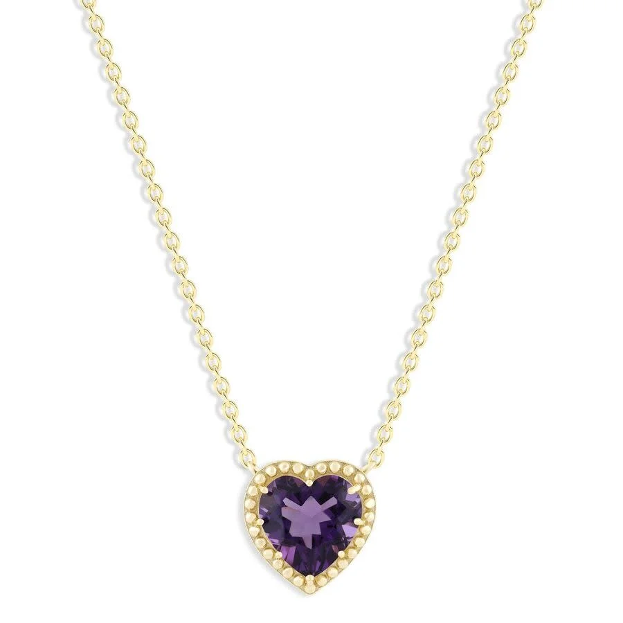 This elegant heart-shaped pendant features a captivating Amethyst birthstone that shimmers with color-changing beauty, symbolizing love and individuality. Crafted in sterling silver with a radiant 14K gold plating, it offers a warm, luxurious finish that complements everyday and special-occasion looks alike. Thoughtfully designed for comfort and shine, this necklace arrives in a gift box, making it a meaningful February birthstone gift for women. DiamondMuse Ladies Necklaces. SKU: UDN0053Z-DYAM. Color: Purple. Metal Type: Sterling Silver. Metal Stamp: 925-Sterling. Metal Weight: 3.2g. Gem stone type: Amethyst. Number of stones: 1. Stone color: Purple. Necklace style: Pendant. Chain type: Cable. Closure type: Spring Ring. DiamondMuse Belacqua Amethyst February Birthstone Heart Pendant Necklace in 14K Gold Plated Sterling Silver. GENERAL Color: Purple INFORMATION Brand: Diamondmuse Gender: Womens Model: UDN0053Z-DYAM DETAILS Size Info: 18 inches Necklaces: Pendant Ring Style: Fashion Chain Type: Cable Closure Type: Spring Ring Material : Sterling Silver Metal Stamp: 925-Sterling Metal Weight: 3.2 Stone Type: Amethyst Stone Color: Purple Stone Origin: Natural Total Stones: 1 ADDITIONAL INFO Jomashop Sku: Y-A5T77 Department: Jewelry Category: Necklaces