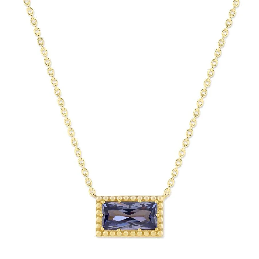 A baguette-cut tanzanite is set in 14K gold plated sterling silver, creating a clean and linear design. The elongated cut highlights the gemstone’s blue-violet color while maintaining a structured appearance. The necklace includes a coordinated chain and comes packaged in a gift box. DiamondMuse Ladies Necklaces. SKU: UDN0055T-DYTZ. Color: Blue. Metal Type: Sterling Silver. Metal Stamp: 925-Sterling. Metal Weight: 3.28g. Gem stone type: Tanzanite. Number of stones: 1. Stone color: Blue. Necklace style: Pendant. Chain type: Cable. Closure type: Spring Ring. DiamondMuse Belacqua Tanzanite December Birthstone Baguette Pendant Necklace in 14K Gold Plated Sterling Silver. GENERAL Color: Blue INFORMATION Brand: Diamondmuse Gender: Womens Model: UDN0055T-DYTZ DETAILS Size Info: 18 inches Necklaces: Pendant Ring Style: Fashion Chain Type: Cable Closure Type: Spring Ring Material : Sterling Silver Metal Stamp: 925-Sterling Metal Weight: 3.28 Stone Type: Tanzanite Stone Color: Blue Stone Origin: Natural Total Stones: 1 ADDITIONAL INFO Jomashop Sku: Y-A5T7J Department: Jewelry Category: Necklaces