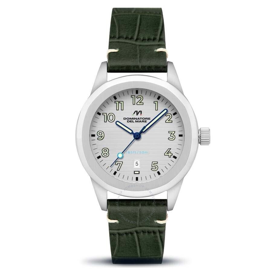 This is the perfect watch to accompany you on any occasion. Crafted with a stainless steel case and bezel and featuring a Japanese quartz movement and date display, the Aqua Sicura is both elegant and precise. The finely crafted dial ensures it looks just as good in a formal setting as it does during casual occasions. Silver-tone stainless steel case with a green leather strap. Fixed silver-tone stainless steel bezel. White dial with blue hands and Arabic numeral hour markers. Minute markers around the outer rim. Dial Type: Analog. Luminescent hands and markers. Date display at the 6 o'clock position. Seiko - VJ32 quartz movement. Pull / push crown. Solid case back. Round case shape, case size: 42 mm, case thickness: 11 mm. Band width: 20 mm, band length: 8 inches. Water resistant at 50 meters / 165 feet. Functions: date, hour, minute, second. Aqua Sicura Series. Casual watch style. Dominatore Del Mare Aqua Sicura Quartz White Dial Men's Watch DD-8022-05. CASE Case Size: 42 Case Thickness: 11 mm Case Material: Stainless Steel Case Shape: Round Case Back: Solid BAND Band Material: Leather Band Type: Strap Band Color: Green Band Length: 8 inches Band Width: 20 mm DIAL Dial Color: White Type: Analog Hands: Blue Dial Markers: Arabic Numeral Second Markers: Minute Markers around the outer rim Luminiscence: Hands and Markers Bezel: Fixed Bezel Color: Silver-tone Bezel Material: Stainless Steel Crown: Pull / Push INFORMATION Brand: Dominatore Del Mare Series: Aqua Sicura Collection Name: Aqua Sicura Gender: Mens Model: DD-8022-05 Movement: Quartz Engine: Seiko - VJ32 FEATURES Water Resistance: 50 meters / 165 feet Calendar: Date display at the 6 o'clock position Functions: Date, Hour, Minute, Second Watch Features: Stainless Steel, Leather, Analog ADDITIONAL INFO Watch Style: Casual Warranty: With Manufacturers Guarantee UPC Code: 194595052480 Jomashop Sku: Y-A4X85 Department: Watches