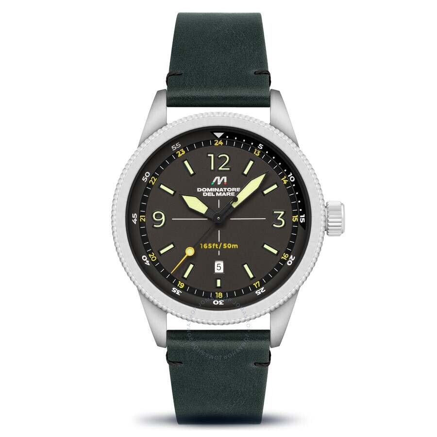 The Aviatore collection features a 42mm case diameter and a two-tone design on the dial. It boasts a versatile style and date display, making it an ideal choice for everyday wear. Showcase your sophisticated style without compromising on accuracy with this classic timepiece. Silver-tone stainless steel case with a green leather strap. Fixed silver-tone stainless steel bezel. Green dial with black hands and Arabic numeral & index hour markers. Minute markers around the outer rim. Dial Type: Analog. Luminescent hands and markers. Date display at the 6 o'clock position. Seiko - VJ32 quartz movement. Pull / push crown. Solid case back. Round case shape, case size: 42 mm, case thickness: 11 mm. Band width: 20 mm, band length: 8 inches. Water resistant at 50 meters / 165 feet. Functions: date, hour, minute, second. Aviatore Series. Casual watch style. Dominatore Del Mare Aviatore Quartz Green Dial Men's Watch DD-8021-07. CASE Case Size: 42 Case Thickness: 11 mm Case Material: Stainless Steel Case Shape: Round Case Back: Solid BAND Band Material: Leather Band Type: Strap Band Color: Green Band Length: 8 inches Band Width: 20 mm DIAL Dial Color: Green Type: Analog Hands: Black Dial Markers: Arabic Numeral & Index Second Markers: Minute Markers around the outer rim Luminiscence: Hands and Markers Bezel: Fixed Bezel Color: Silver-tone Bezel Material: Stainless Steel Crown: Pull / Push INFORMATION Brand: Dominatore Del Mare Series: Aviatore Collection Name: Aviatore Gender: Mens Model: DD-8021-07 Movement: Quartz Engine: Seiko - VJ32 FEATURES Water Resistance: 50 meters / 165 feet Calendar: Date display at the 6 o'clock position Functions: Date, Hour, Minute, Second Watch Features: Stainless Steel, Leather, Analog ADDITIONAL INFO Watch Style: Casual Warranty: With Manufacturers Guarantee UPC Code: 194595052343 Jomashop Sku: Y-A4X83 Department: Watches