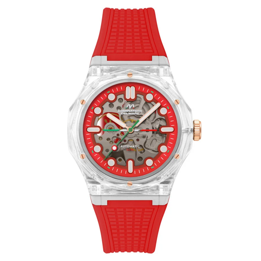 Ravello Automatic is a bold tribute to the natural beauty and vibrant spirit of Ravello, the jewel of the Amalfi Coast. Its intricate skeleton dial reveals the artistry of its automatic movement, while the semi-transparent case captures the glow of Amalfi sunsets and the vibrance of Ravello’s festivals. Like the coastal town, the Ravello Automatic marks a remarkable presence on your wrist. White plastic case with a red silicone strap. Fixed white plastic bezel. Red dial with rose gold-tone hands and index hour markers. Minute markers around the outer rim. Dial Type: Analog. Luminescent hands and markers. PST Caliber PST-2650 automatic movement. Scratch resistant mineral crystal. Pull / push crown. Solid case back. Round case shape, case size: 45 mm, case thickness: 13 mm. Band width: 20 mm, band length: 8 inches. Water resistant at 50 meters / 165 feet. Functions: hour, minute, second. Ravello Series. Casual watch style. Dominatore Del Mare Ravello Automatic Red Dial Men's Watch DD-8029-06. GENERAL Box Type: Original Box CASE Case Diameter: 45 mm Case Thickness: 13 mm Case Material: Plastic Case Shape: Round Case Back: Solid BAND Band Material: Silicone Band Type: Strap Band Color: Red Band Length: 8 inches Band Width: 20 mm DIAL Dial Color: Red Type: Analog Crystal: Scratch Resistant Mineral Hands: Rose Gold-tone Dial Markers: Index Second Markers: Minute Markers around the outer rim Luminiscence: Hands and Markers Bezel: Fixed Bezel Color: White Bezel Material: Plastic Crown: Pull / Push INFORMATION Brand: Dominatore Del Mare Series: Ravello Collection Name: Ravello Gender: Mens Model: DD-8029-06 Movement: Automatic Engine: PST Caliber PST-2650 FEATURES Water Resistance: 50 meters / 165 feet Functions: Hour, Minute, Second Watch Features: Analog, Gold, Plastic ADDITIONAL INFO Watch Style: Casual Warranty: With Manufacturers Guarantee UPC Code: 194595074130 Jomashop Sku: Y-A5MWF Department: Watches