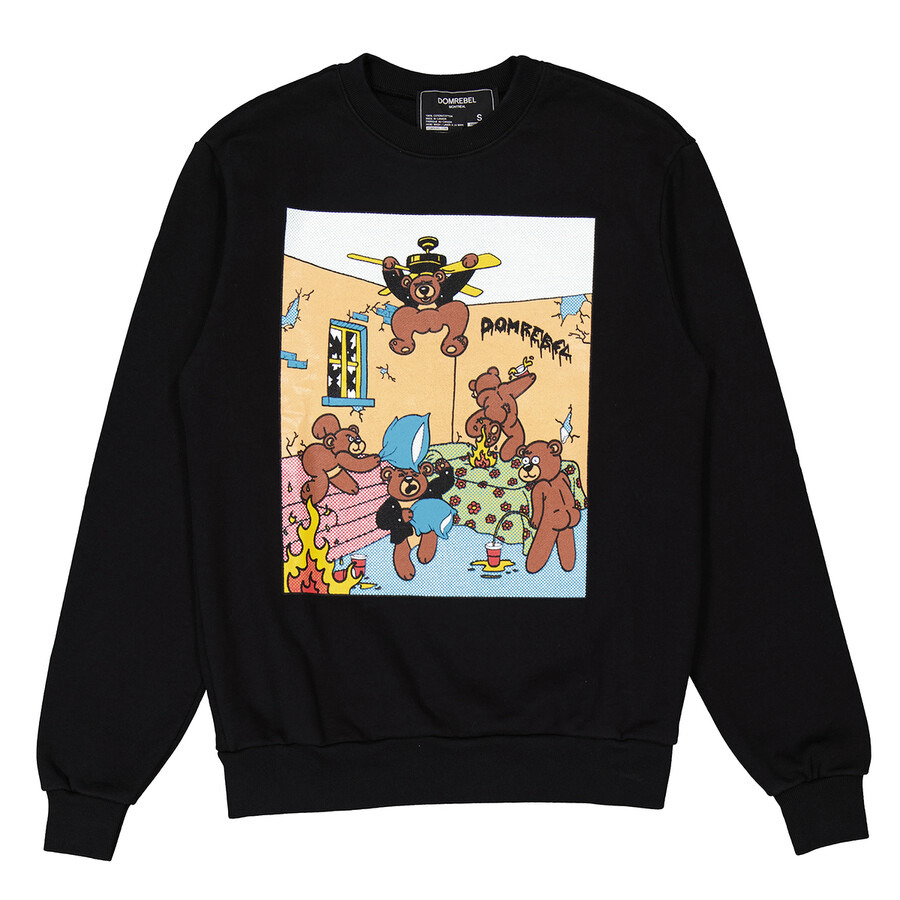 SKU: HOTEL SWTSHT-BLACK. Color: Black. Domrebel Hotel Box Sweatshirt in Black. Crafted from cotton, this sweatshirt from Domrebel features long sleeves, a ribbed hem and cuffs, a ribbed crewneck, a print at the rear and Domrebel bears partying in hotel print at front. Material: 100% Cotton. GENERAL Color: Black INFORMATION Brand: Domrebel Gender: Mens Model: HOTEL SWTSHT-BLACK DETAILS Category: Tops Apparel Type: Hoodies & Sweatshirts ADDITIONAL INFO Jomashop Sku: -HOTELSWTSHTBLACK Department: Apparel