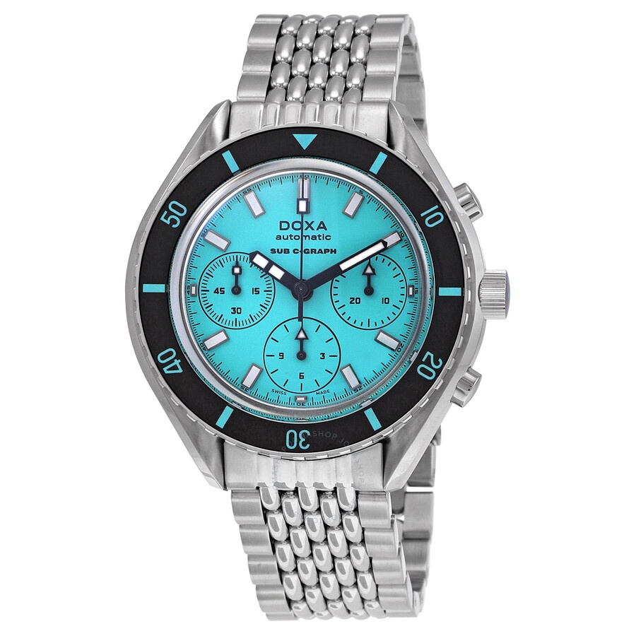 Silver-tone stainless steel case and bracelet. Uni-directional rotating black bezel. Blue dial with black hands and index hour markers. Minute markers around the outer rim. Dial Type: Analog. Luminescent hands and markers. Chronograph - sub-dials displaying: 12 hours, 30 minutes, 60 minutes. Automatic movement with a 48-hour power reserve. Scratch resistant sapphire crystal. Screw down crown. Round case shape, case size: 45 mm. Folding with wetsuit extension clasp. Water resistant at 200 meters / 660 feet. Functions: chronograph, hour, minute, second. Sub 200 C-graph Aquamarine Series. Watch label: Swiss Made. Doxa SUB 200 C-Graph Aquamarine Chronograph Automatic Blue Dial Men's Watch 798.10.241.10. INFORMATION Brand: Doxa Series: Sub 200 C-Graph Aquamarine Collection Name: SUB 200 C-Graph Aquamarine Gender: Mens Model: 798.10.241.10 Watch Label: Swiss Made Movement: Automatic Power Reserve: 48 hours CASE Case Size: 45 mm Case Material: Stainless Steel Case Shape: Round BAND Band Material: Stainless Steel Band Type: Bracelet Band Color: Silver-tone Clasp: Folding clasp with wetsuit extension DIAL Dial Color: Blue Type: Analog Crystal: Scratch Resistant Sapphire Hands: Black Dial Markers: Index Second Markers: Minute Markers around the outer rim Sub Dials: 12 Hours, 30 Minutes, 60 Minutes Luminiscence: Hands and Markers Bezel: Uni-directional Rotating Bezel Color: Black Crown: Screw Down FEATURES Water Resistance: 200 meters / 660 feet Functions: Chronograph, Hour, Minute, Second Watch Features: Chronograph, Stainless Steel, Analog ADDITIONAL INFO Warranty: 2 Year Jomashop Warranty Jomashop Sku: Z-DQ2SA Department: Watches Category: Watches