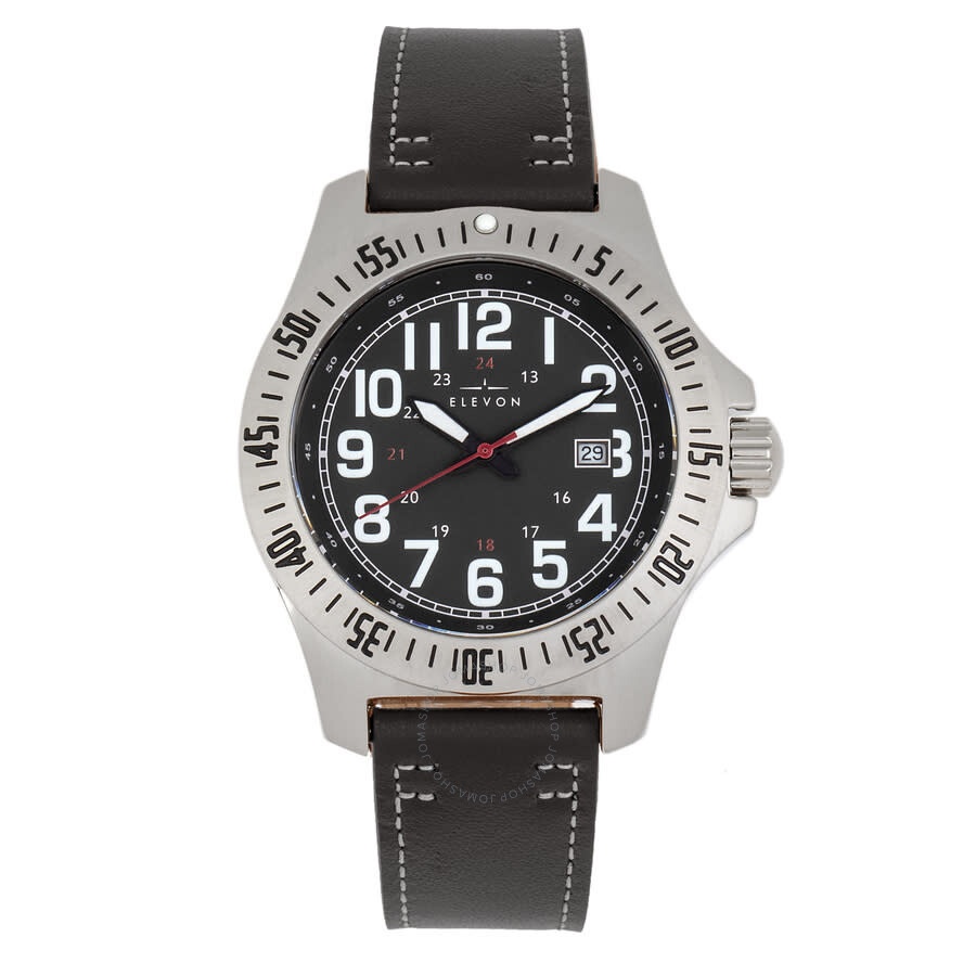 304L Stainless Steel Case Japanese Quartz Movement Non-Glare Scratch-Resistant Mineral Crystal Logo-Engraved Stainless Steel Caseback Uni-directional Bezel Crown Protector Case Design Genuine Leather Strap Logo-Engraved Stainless Steel Clasp Luminous Hands Date Display 43mm Case Diameter 5ATM Water Resistance CASE Case Size: 48 Case Thickness: 13 mm Case Material: Stainless Steel Case Shape: Round BAND Band Material: Leather Band Type: Strap Band Color: Black Band Length: 9 inches Band Width: 20 mm Clasp: Buckle DIAL Dial Color: Black Type: Analog Crystal: Scratch Resistant Mineral Hands: Black Dial Markers: Arabic Numeral & Index Second Markers: Minute Markers around the outer rim Luminiscence: Hands Bezel: Uni-directional Rotating Bezel Color: Silver-tone Bezel Material: Stainless Steel Crown: Pull / Push INFORMATION Brand: Elevon Series: Aviator Collection Name: Aviator Gender: Mens Model: ELE120-9 Watch Label: Japan Movt Movement: Quartz FEATURES Water Resistance: 50 meters / 165 feet Calendar: Date display at the 3 o'clock position Functions: Date, Hour, Minute, Second Watch Features: Stainless Steel, Leather, Analog ADDITIONAL INFO Watch Style: Fashion Warranty: With Manufacturers Guarantee UPC Code: 847864193895 Jomashop Sku: Y-A4APT Department: Watches Category: Watches