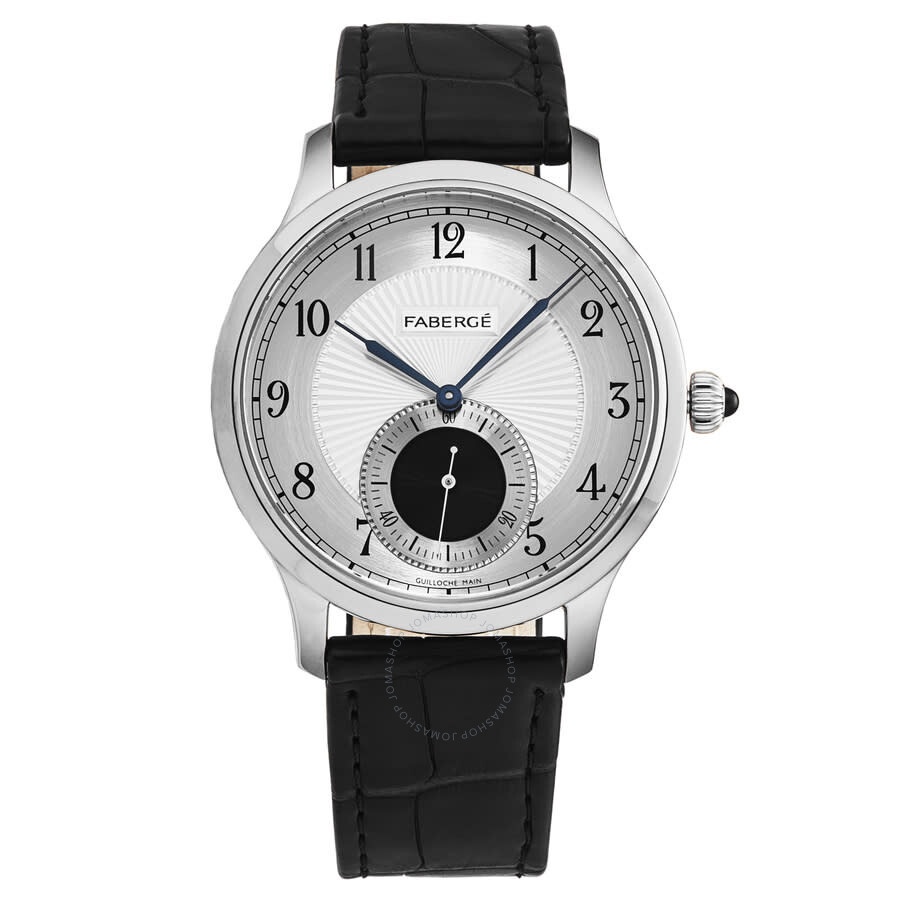 18kt white gold case with a black leather strap. Fixed 18kt white gold bezel. Silver-tone dial with blue hands and Arabic numeral hour markers. Minute markers around the outer rim. Dial Type: Analog. Automatic movement. Scratch resistant sapphire crystal. Pull / push crown. Transparent case back. Round case shape, case size: 40 mm, case thickness: 10 mm. Band width: 20 mm, band length: 8 inches. Tang clasp. Water resistant at 50 meters / 165 feet. Functions: hour, minute, second. Additional Info: hour, minute, second. Agathon Series. Luxury watch style. Faberge Agathon Automatic Silver Dial Men's Watch FAB-215. INFORMATION Brand: Faberge Series: Agathon Collection Name: Agathon Gender: Mens Model: FAB-215 Movement: Automatic CASE Case Size: 40 mm Case Thickness: 10 mm Case Material: 18kt White Gold Case Shape: Round Case Back: Transparent BAND Band Material: Leather Band Type: Strap Band Color: Black Band Length: 8 inches Band Width: 20 mm Clasp: Tang DIAL Dial Color: Silver-tone Type: Analog Crystal: Scratch Resistant Sapphire Hands: Blue Dial Markers: Arabic Numeral Second Markers: Minute Markers around the outer rim Bezel: Fixed Bezel Material: 18kt White Gold Crown: Pull / Push FEATURES Water Resistance: 50 meters / 165 feet Functions: Hour, Minute, Second Watch Features: Leather, Gold, Analog ADDITIONAL INFO Watch Style: Luxury Warranty: 2 Year Jomashop Warranty Additional Info: Hour, Minute, Second Jomashop Sku: Y-A24MP Department: Watches Category: Watches