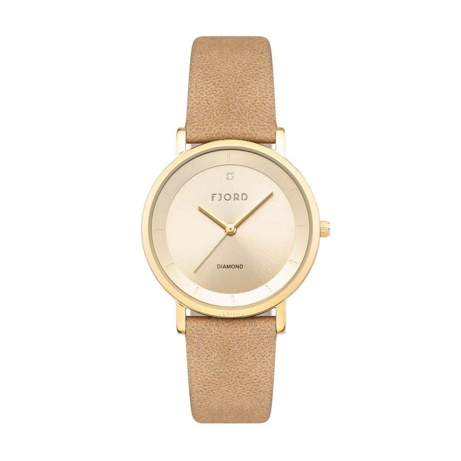 Yellow gold-tone stainless steel case with a brown leather strap. Fixed yellow gold-tone stainless steel bezel. Beige dial with yellow gold-tone hands and index hour markers. Dial Type: Analog. Quartz movement. Round case shape, case size: 32 mm. Functions: hour, minute, second. Jensen Series. Dress watch style. Fjord Jensen Beige Dial Ladies Watch FJ-6062-04. INFORMATION Brand: Fjord Series: Jensen Collection Name: Jensen Gender: Womens Model: FJ-6062-04 Movement: Quartz CASE Case Size: 32 mm Case Material: Stainless Steel Case Shape: Round BAND Band Material: Leather Band Type: Strap Band Color: Brown DIAL Dial Color: Beige Type: Analog Hands: Yellow Gold-tone Dial Markers: Index Bezel: Fixed Bezel Color: Yellow Gold-tone Bezel Material: Stainless Steel FEATURES Functions: Hour, Minute, Second Watch Features: Stainless Steel, Leather, Gold, Analog ADDITIONAL INFO Watch Style: Dress Jomashop Sku: Y-A2RNV Department: Watches Category: Watches