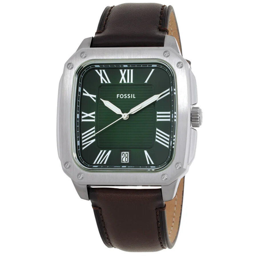 Silver-tone stainless steel case with a brown leather strap. Fixed silver-tone stainless steel bezel. Green dial with silver-tone hands and Roman numeral hour markers. Minute markers around the outer rim. Dial Type: Analog. Luminescent hands. Date display at the 6 o'clock position. Quartz movement. Scratch resistant mineral crystal. Pull / push crown. Solid case back. Square case shape, case size: 42 mm. Buckle clasp. Water resistant at 50 meters / 165 feet. Functions: date, hour, minute, second. Crosby Series. Fossil Crosby Quartz Green Dial Men's Watch FS6150. GENERAL Box Type: Original Box CASE Case Diameter: 42 mm Case Material: Stainless Steel Case Shape: Square Case Back: Solid BAND Band Material: Leather Band Type: Strap Band Color: Brown Clasp: Buckle DIAL Dial Color: Green Type: Analog Crystal: Scratch Resistant Mineral Hands: Silver-tone Dial Markers: Roman Numeral Second Markers: Minute Markers around the outer rim Luminiscence: Hands Bezel: Fixed Bezel Color: Silver-tone Bezel Material: Stainless Steel Crown: Pull / Push INFORMATION Brand: Fossil Series: Crosby Collection Name: Crosby Gender: Mens Model: FS6150 Movement: Quartz FEATURES Water Resistance: 50 meters / 165 feet Calendar: Date display at the 6 o'clock position Functions: Date, Hour, Minute, Second Watch Features: Stainless Steel, Leather, Analog ADDITIONAL INFO Warranty: 2 Year Jomashop Warranty UPC Code: 4064092366617 Jomashop Sku: FSFS6150 Department: Watches