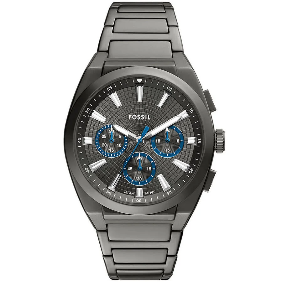 Black stainless steel case and bracelet. Fixed black stainless steel bezel. Grey dial with silver-tone hands and index hour markers. Minute markers around the outer rim. Dial Type: Analog. Luminescent hands and markers. Quartz movement. Scratch resistant mineral crystal. Solid case back. Round case shape, case size: 44 mm. Band width: 24 mm, band length: 7.5 inches. Fold over clasp. Functions: chronograph, hour, minute, second. Everett Chronograph Series. Fashion watch style. Fossil Everett Chronograph Quartz Grey Dial Men's Watch FS6107. GENERAL Box Type: Original Box CASE Case Material: Stainless Steel Case Shape: Round Case Back: Solid BAND Band Material: Stainless Steel Band Type: Bracelet Band Color: Black Band Length: 7.5 inches Band Width: 24 mm Clasp: Fold Over DIAL Dial Color: Grey Type: Analog Crystal: Scratch Resistant Mineral Hands: Silver-tone Dial Markers: Index Second Markers: Minute Markers around the outer rim Luminiscence: Hands and Markers Bezel: Fixed Bezel Color: Black Bezel Material: Stainless Steel INFORMATION Brand: Fossil Series: Everett Chronograph Collection Name: Everett Chronograph Gender: Mens Model: FS6107 Movement: Quartz FEATURES Functions: Chronograph, Hour, Minute, Second Watch Features: Analog, Stainless Steel, Chronograph ADDITIONAL INFO Watch Style: Fashion Warranty: 2 Year Jomashop Warranty UPC Code: 796483676343 Jomashop Sku: FSFS6107 Department: Watches