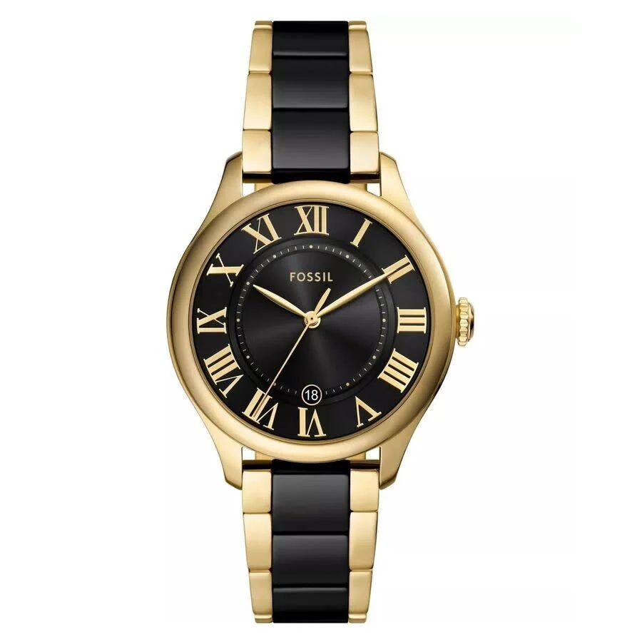 Yellow gold-tone stainless steel case with a two-tone (black and gold-tone) stainless steel bracelet. Fixed yellow gold-tone stainless steel bezel. Black dial with yellow gold-tone hands and Roman numeral hour markers. Minute scale around the inner rim. Dial Type: Analog. Date display at the 6 o'clock position. Quartz movement. Scratch resistant mineral crystal. Solid case back. Round case shape, case size: 38 mm. Band width: 18 mm, band length: 7.5 inches. Fold over clasp. Functions: date, hour, minute, second. Gilmore Series. Fashion watch style. Fossil Gilmore Quartz Black Dial Ladies Watch CE1132. GENERAL Box Type: Original Box CASE Case Material: Stainless Steel Case Shape: Round Case Back: Solid BAND Band Material: Stainless Steel Band Type: Bracelet Band Color: Two-tone (Black and Gold-tone) Band Length: 7.5 inches Band Width: 18 mm Clasp: Fold Over DIAL Dial Color: Black Type: Analog Crystal: Scratch Resistant Mineral Hands: Yellow Gold-tone Dial Markers: Roman Numeral Second Markers: Minute Scale around the inner rim Bezel: Fixed Bezel Color: Yellow Gold-tone Bezel Material: Stainless Steel INFORMATION Brand: Fossil Series: Gilmore Collection Name: Gilmore Gender: Womens Model: CE1132 Movement: Quartz FEATURES Calendar: Date display at the 6 o'clock position Functions: Date, Hour, Minute, Second Watch Features: Analog, Gold, Stainless Steel ADDITIONAL INFO Watch Style: Fashion Warranty: 2 Year Jomashop Warranty Jomashop Sku: FSCE1132 Department: Watches